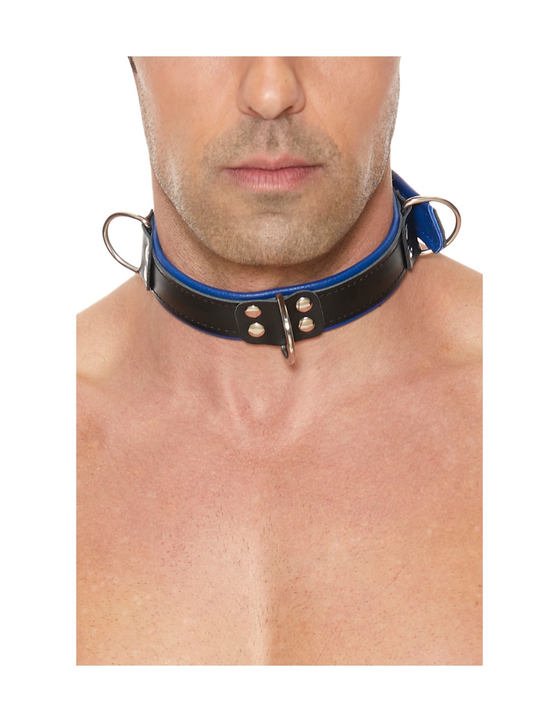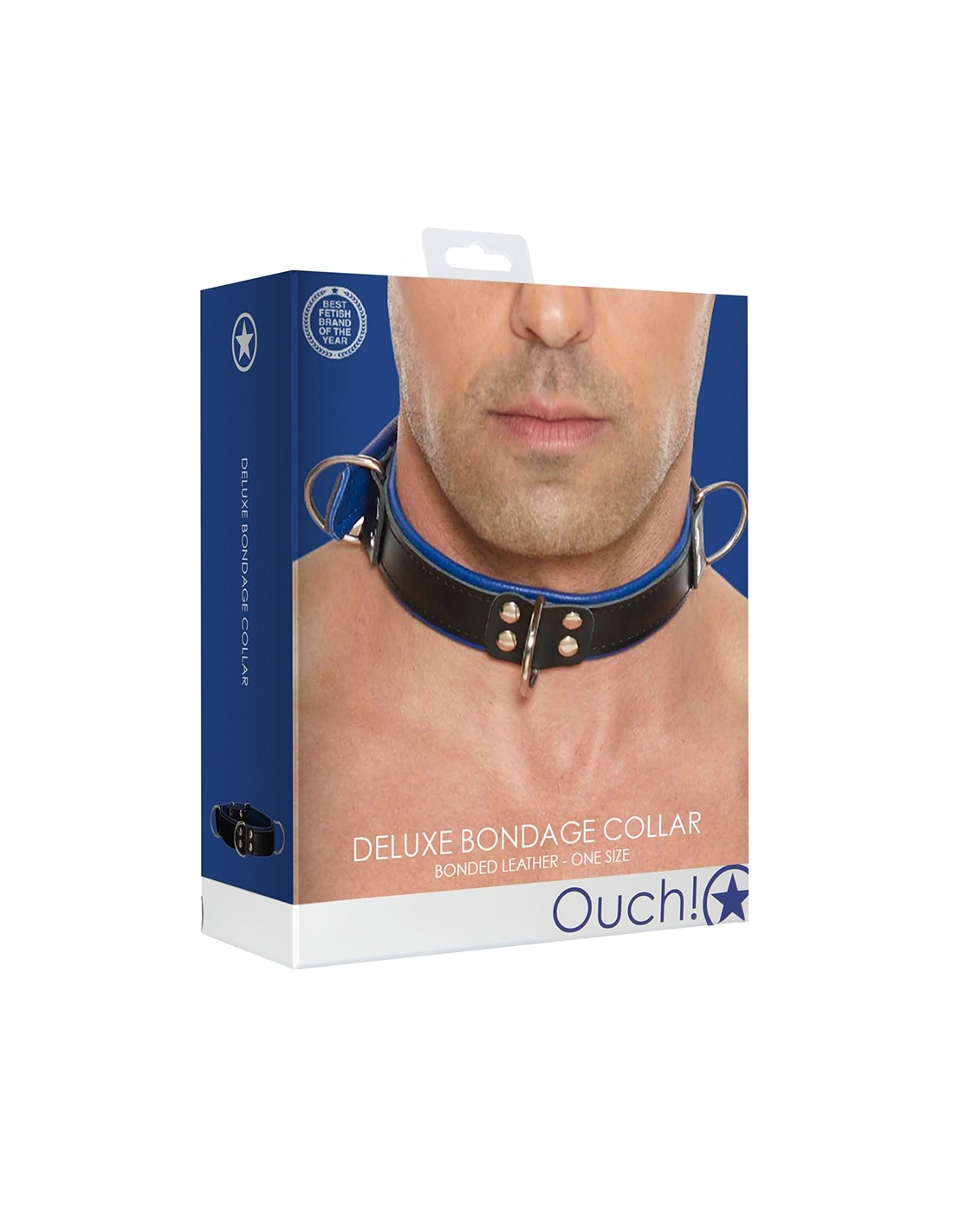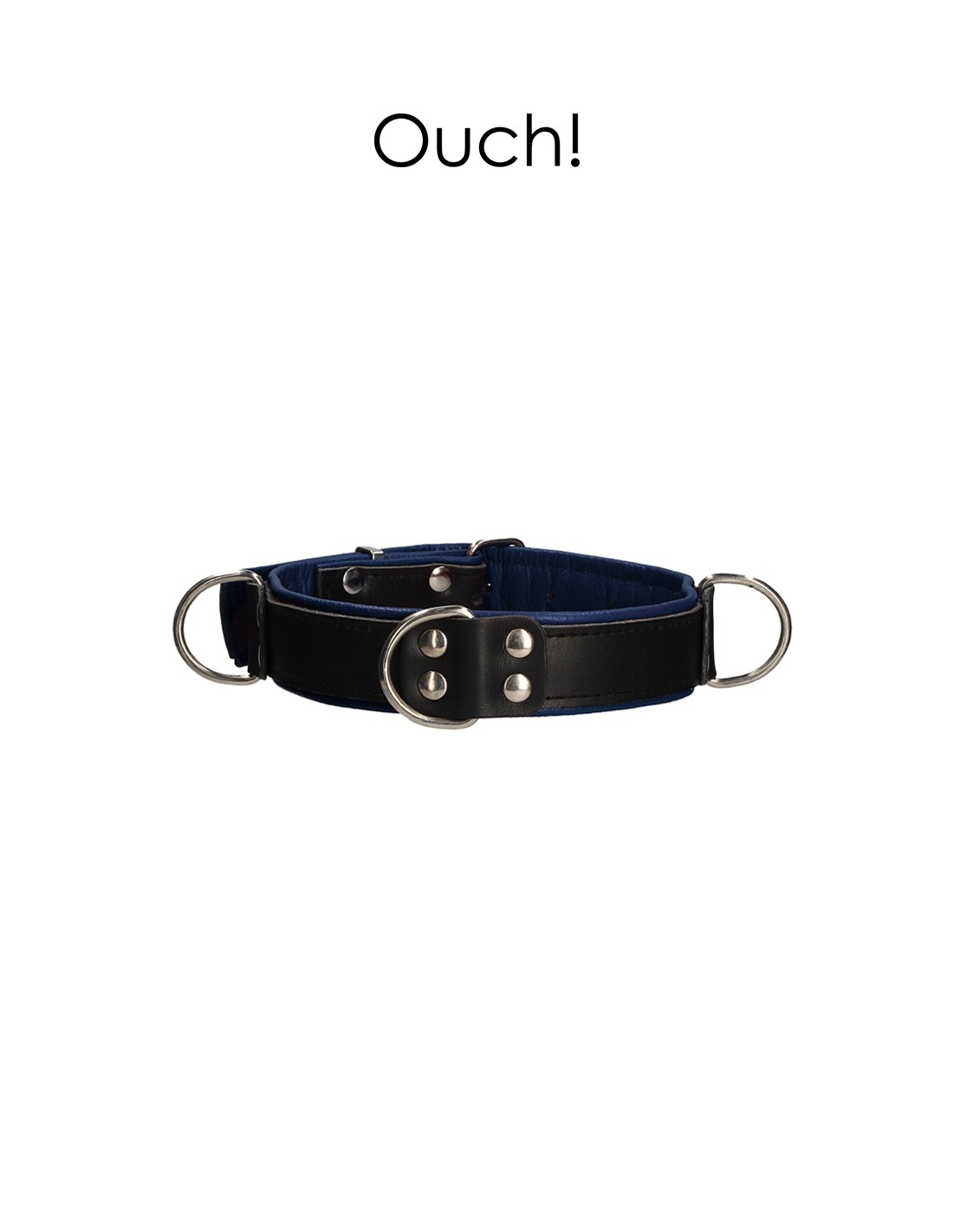 La marque Ouch!, spécialiste des jeux BDSM, propose ce collier de soumission de grande qualité en cuir reconstitué bleu surpiqué de cuir noir, équipé de trois anneaux en D en acier inoxydable auxquels vous pourrez fixer une laisse, des cordes, des chaines ou encore des menottes.