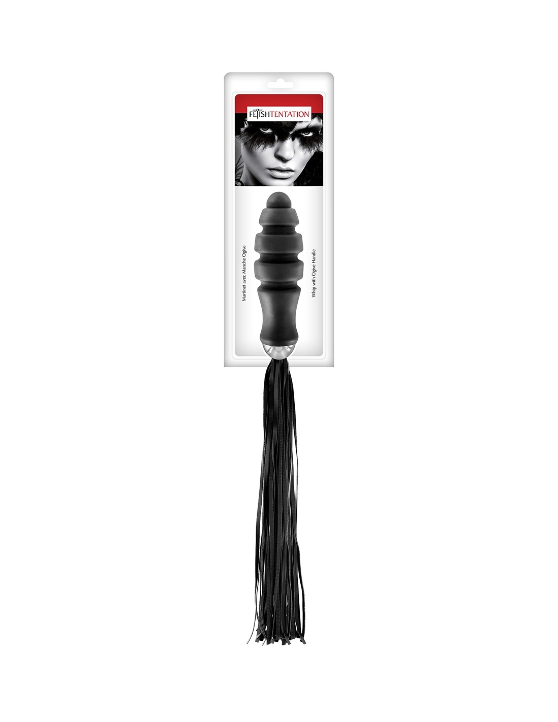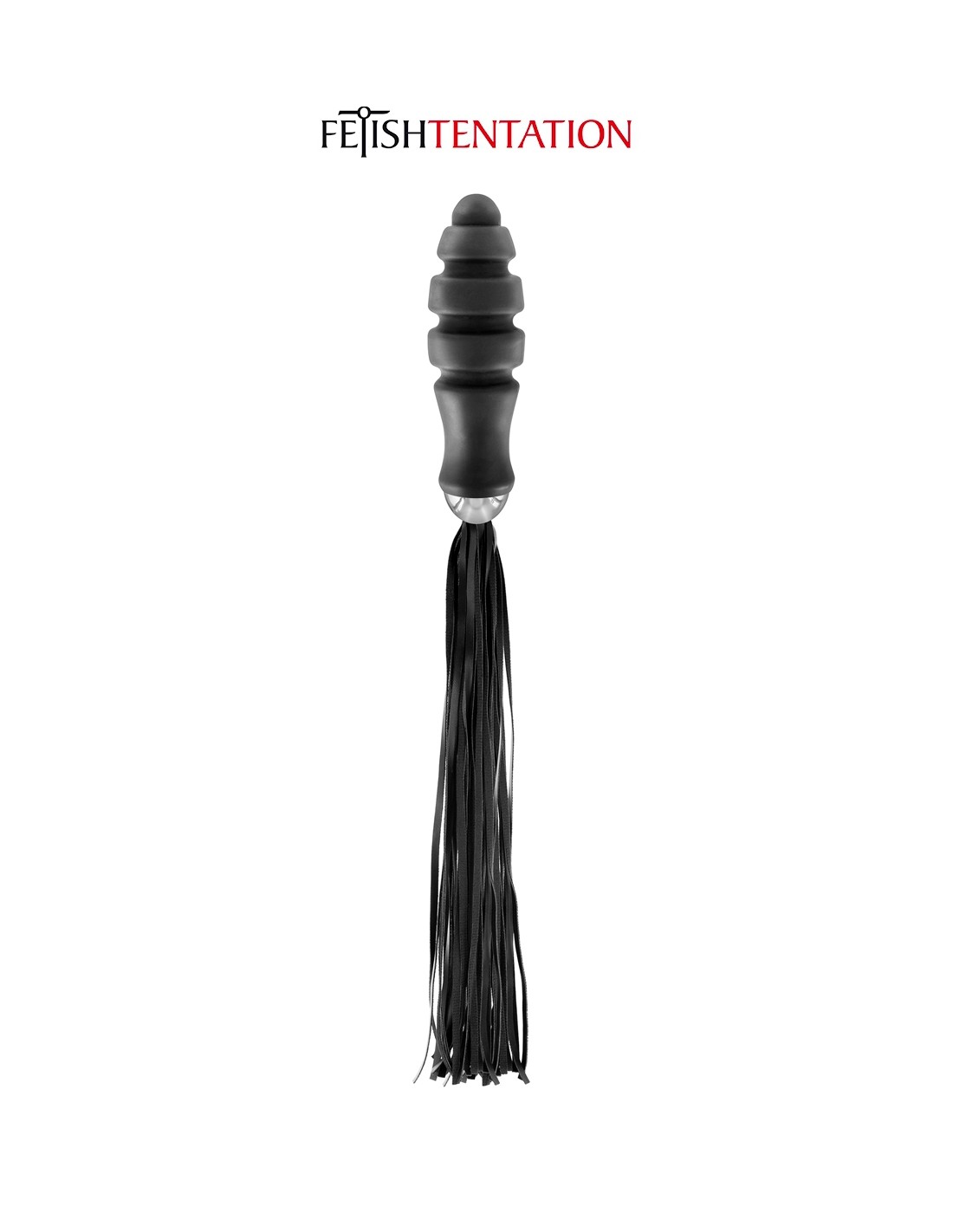 D'inspiration BDSM, le martinet avec manche en forme d'ogive, développé par la marque Fetish Tentation, est un accessoire de plaisir 2 en 1 intégrant d'un côté un martinet, et de l'autre un godemiché dédié à la stimulation vaginale et anale.