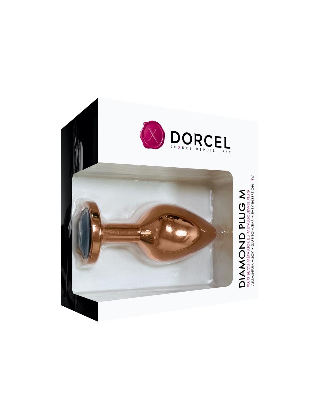 Der Diamond Plug M von Dorcel ist ein hochwertiger, juwelenbesetzter Aluminium-Plug in Roségold mit einem Edelstein, der einem schwarzen Diamanten ähnelt, an seinem Ende.