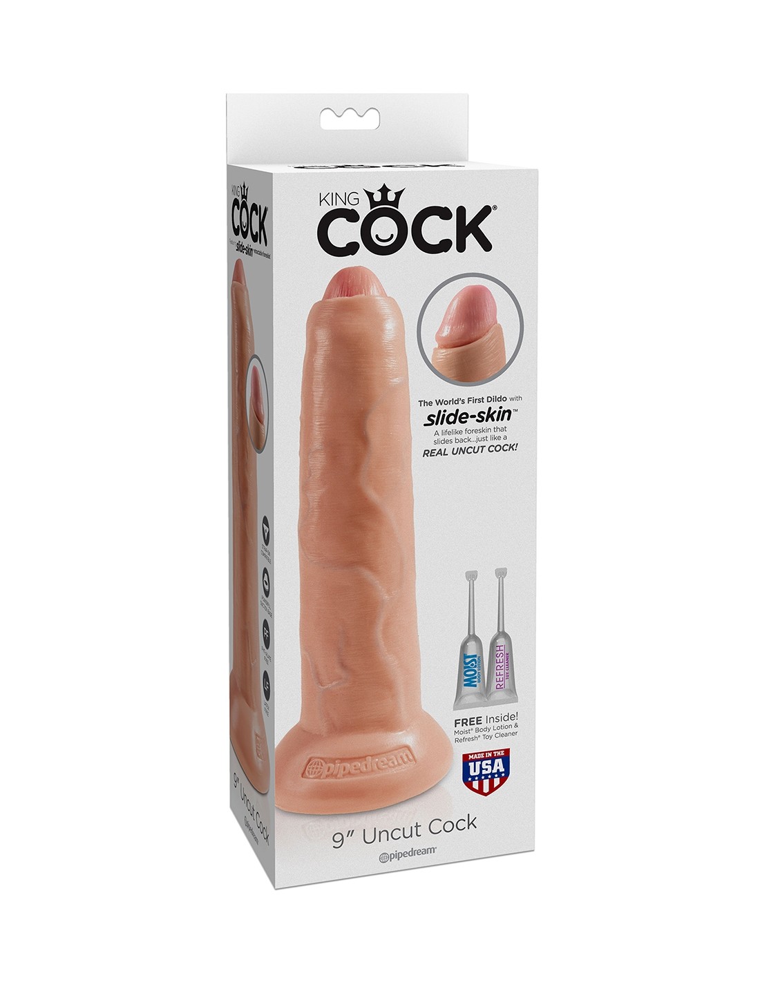 Uncut King Cock ist phthalatfrei, latexfrei, körperverträglich und hypoallergen und wird in den USA handgefertigt. Es nutzt die patentierte Dual-Density-„Slide-Skin“-Formel von Pipedream und bietet eine einziehbare Vorhaut, die den Penis noch realistischer macht.