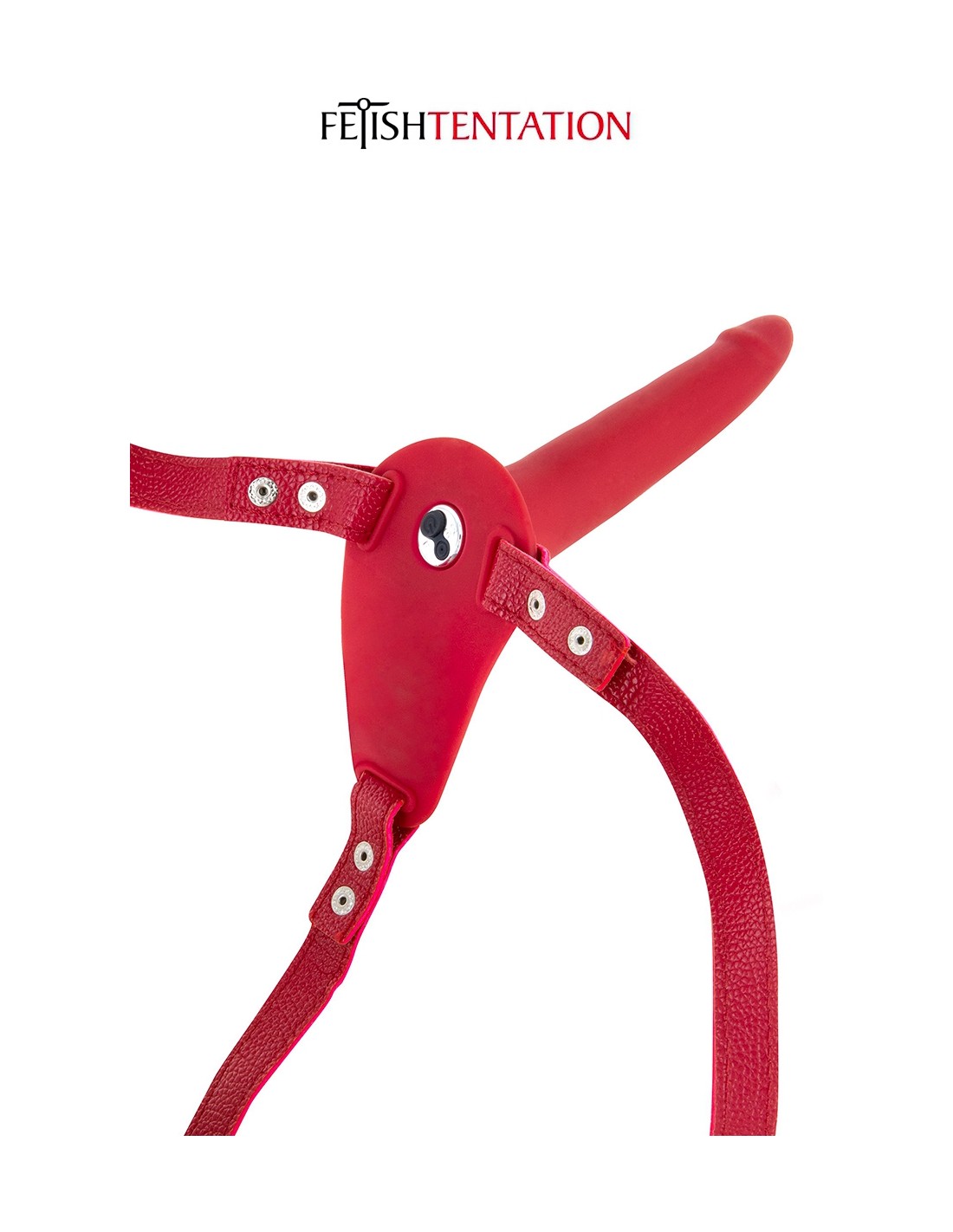 Este strap-on dildo rojo vibrador y recargable de la marca Fetish Tentation puede ser usado por un hombre o una mujer según sus deseos y ofrece nuevas posibilidades de disfrute.