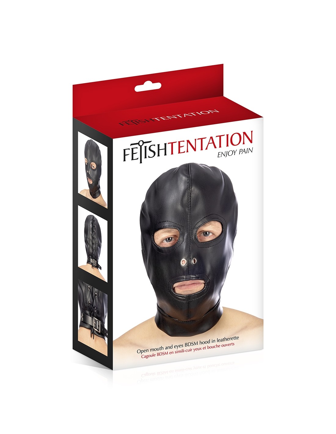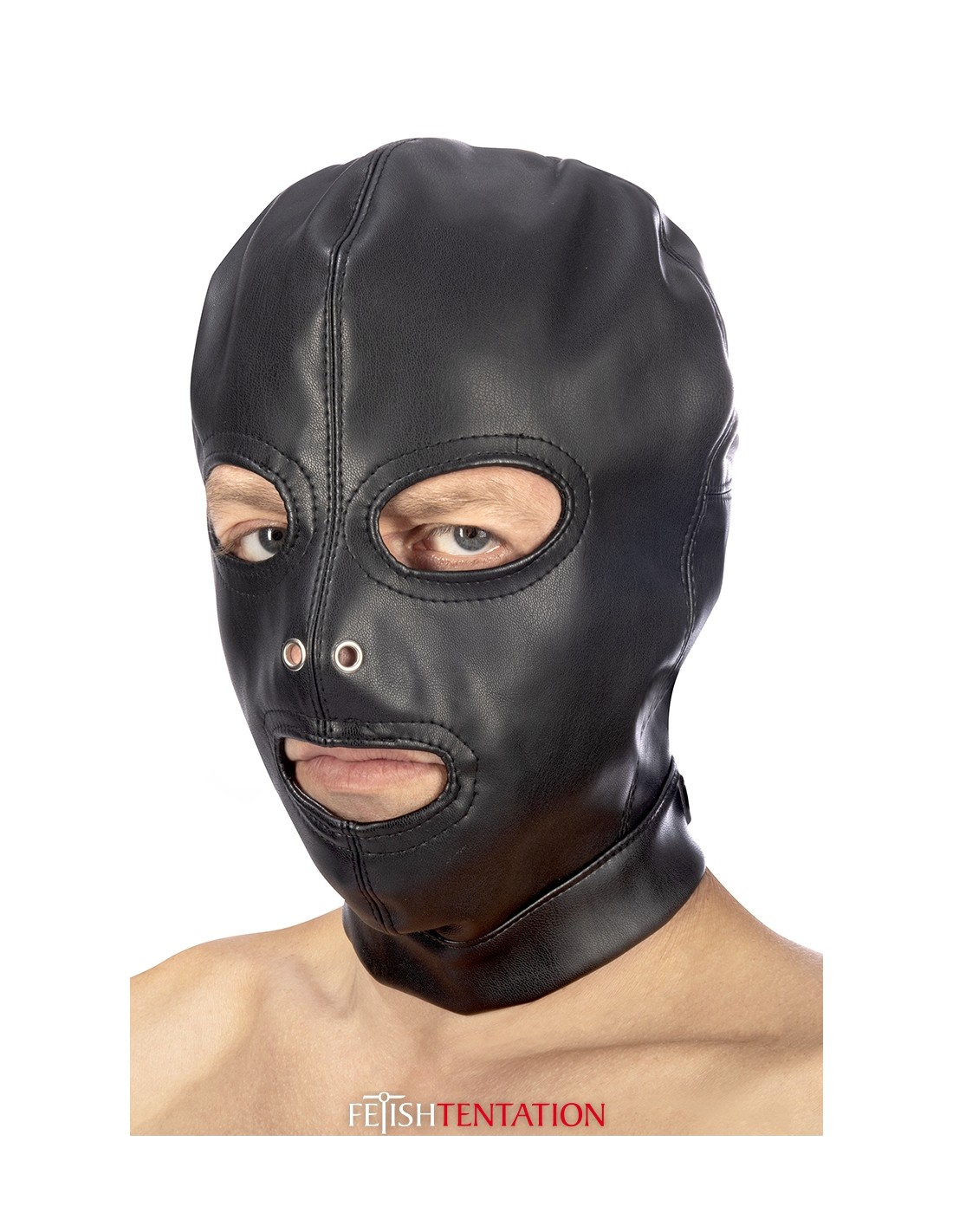 Cagoule Fetish SM de haute qualité, en faux cuir, avec ouverture au niveau de la bouche et des yeux, par Fetish Tentation.