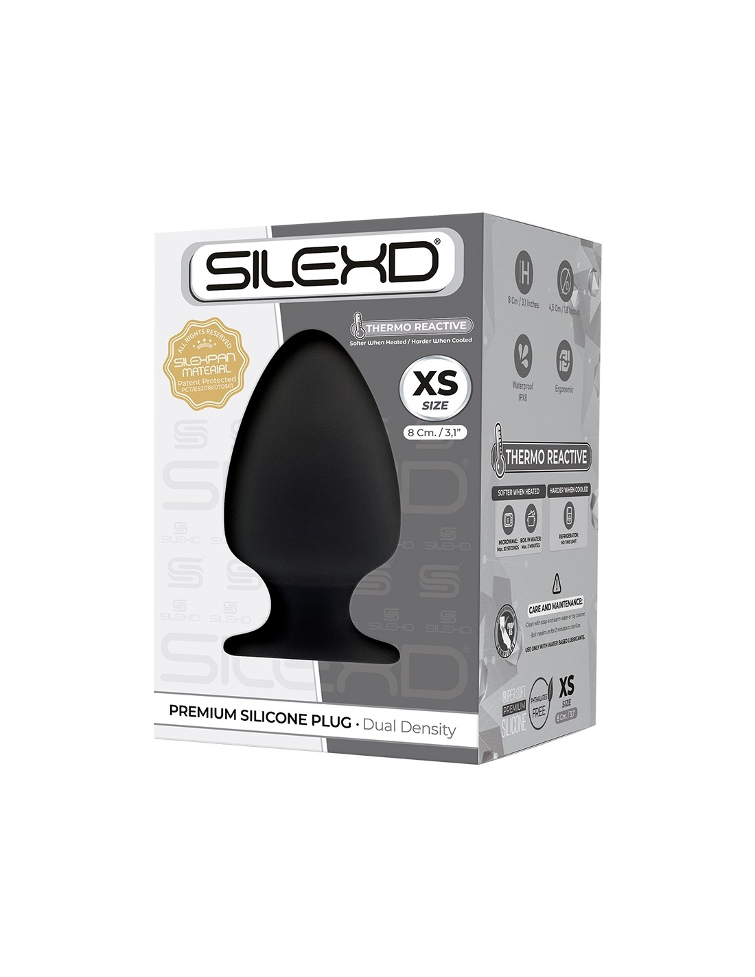 La marca SilexD ofrece a los amantes del placer anal este lujoso plug anal tamaño XSmall, de doble densidad y termorreactivo, de 8 cm de largo por 4,5 cm de diámetro, fabricado en silicona Premium con memoria de forma.