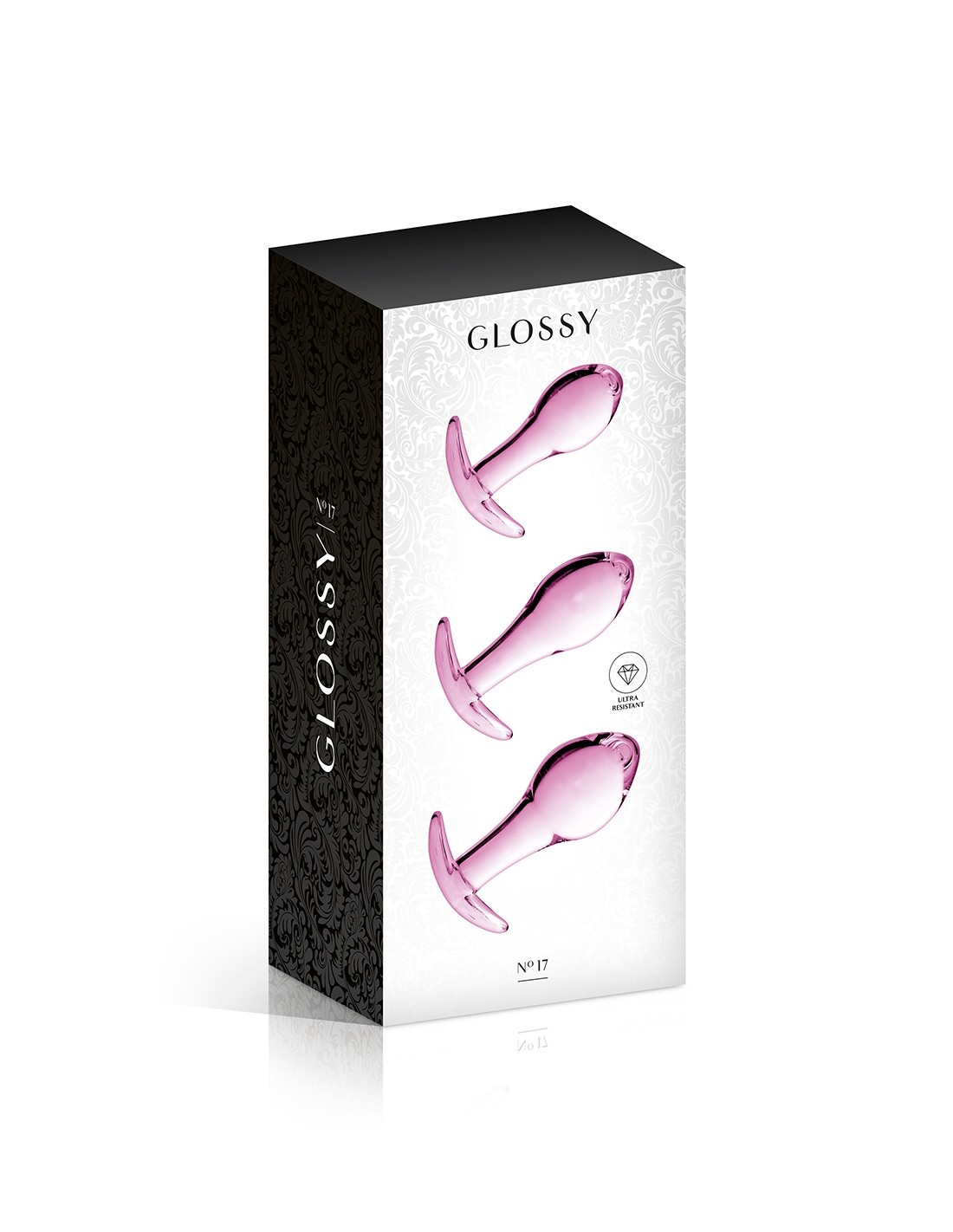 Caja de 3 plugs anales Glossy Toys de alta calidad, en cristal rosa irrompible, de diferentes longitudes y tamaños, para ofrecerte sensaciones más o menos intensas según tus deseos.