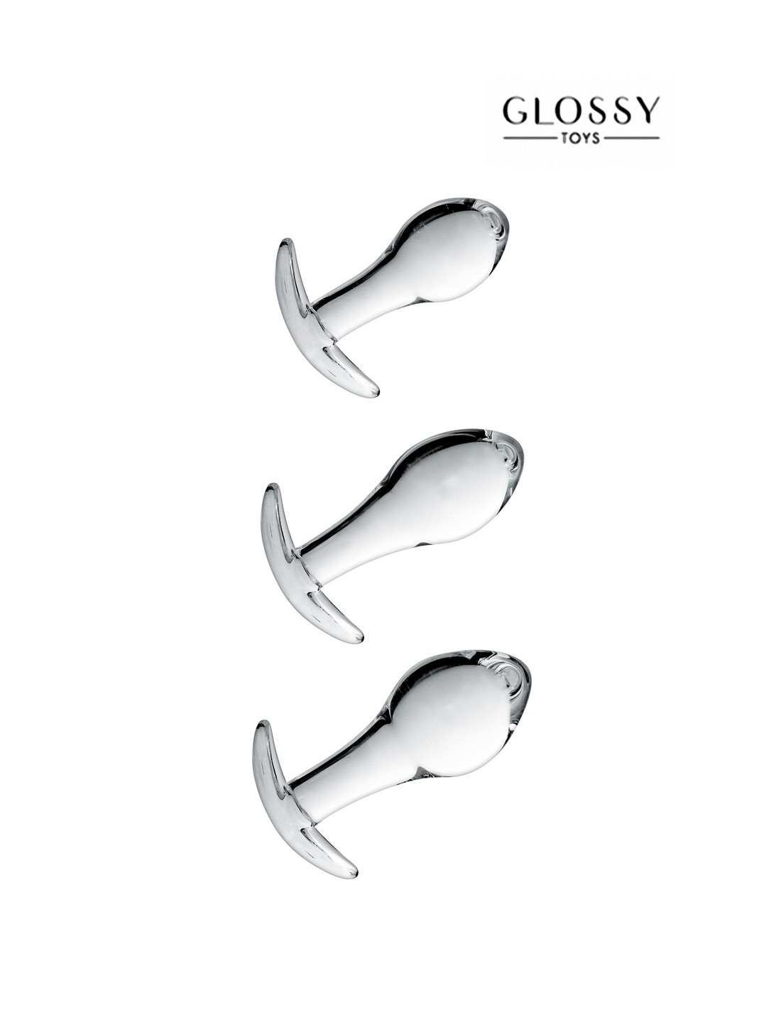 Caja de 3 plugs anales Glossy Toys de alta calidad, en cristal irrompible, de diferentes longitudes y tamaños, para ofrecerte sensaciones más o menos intensas según tus deseos.