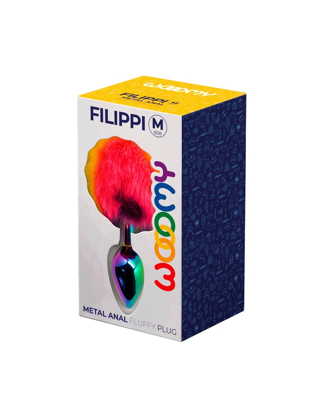 Tanto un juguete sexual anal, una joya traviesa como un accesorio de juego BDSM, el plug Filippi Raimbow de tamaño mediano de Wooomy es un juguete íntimo particularmente original y sexy con sus colores amigables LGBTQ+ y su pompón de piel sintética unido a su extremo.