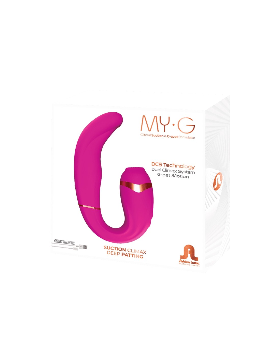 My.G de Adrien Lastic es un estimulador Doble dedicado al placer femenino con estimulación por succión en el clítoris y estimulación de la vagina (punto G) por vibraciones y golpecitos.