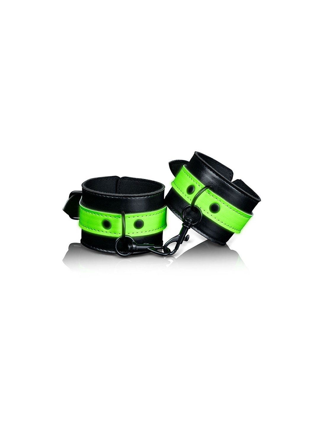 Paire de Menottes pour poignets qui brillent dans le noir, ajustables, haute qualité, en cuir reconstitué et métal, proposées par la marque Ouch!