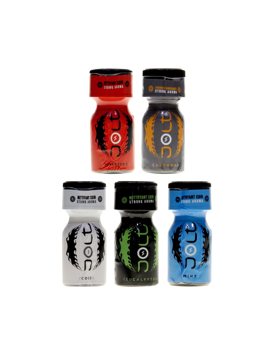 El pack Jolt 5 sabores se ofrece en forma de 5 botes de 10 ml equipados con tapones de seguridad. Cada uno de ellos contiene un aroma afrodisíaco de calidad, a base de Isopropilo, con un aroma diferente.