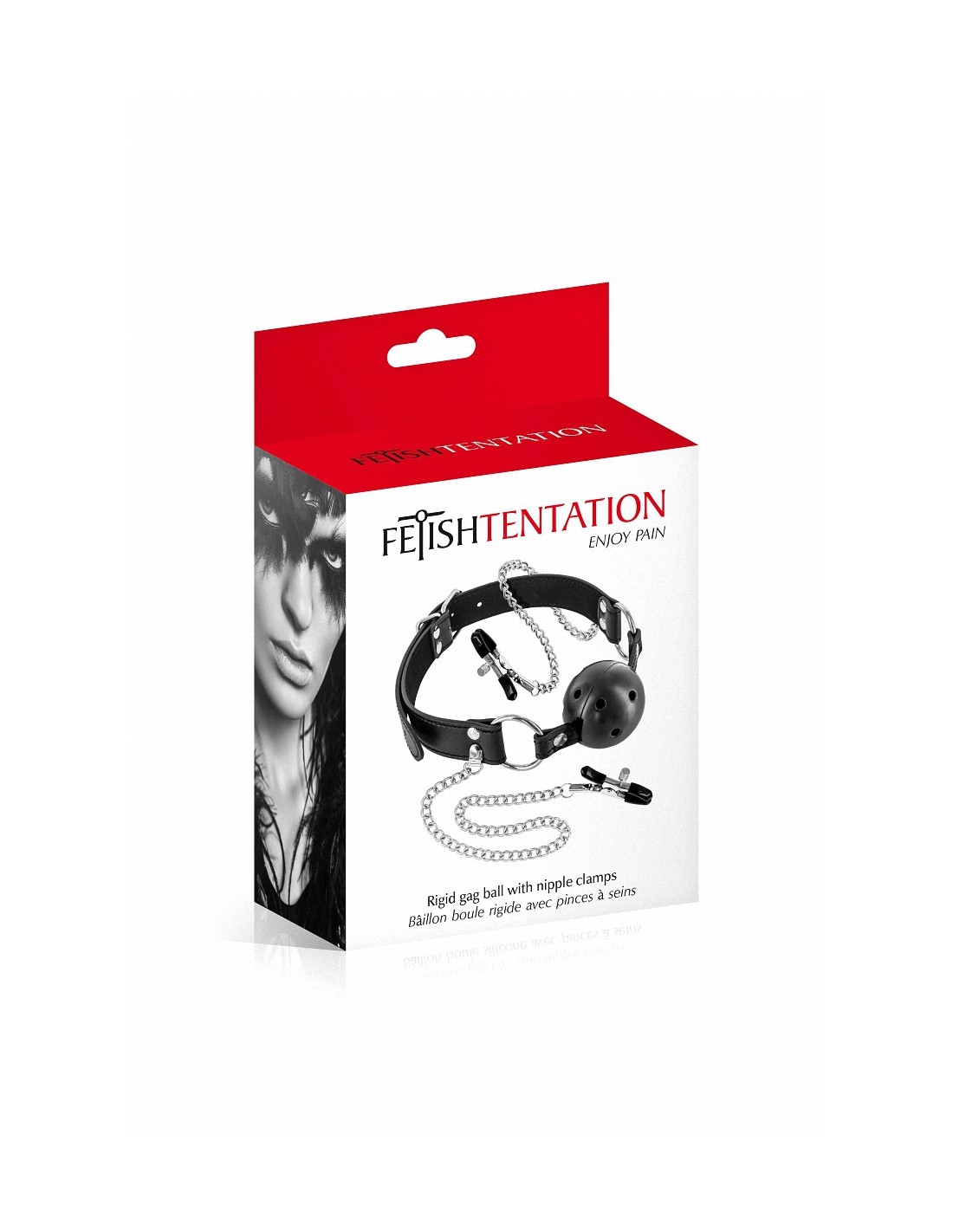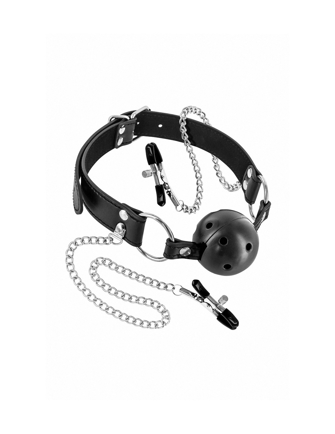 Bâillon avec boule rigide percée et pinces à seins réglables en métal reliées au Gagged Ball, par la marque Fetish Tentation.