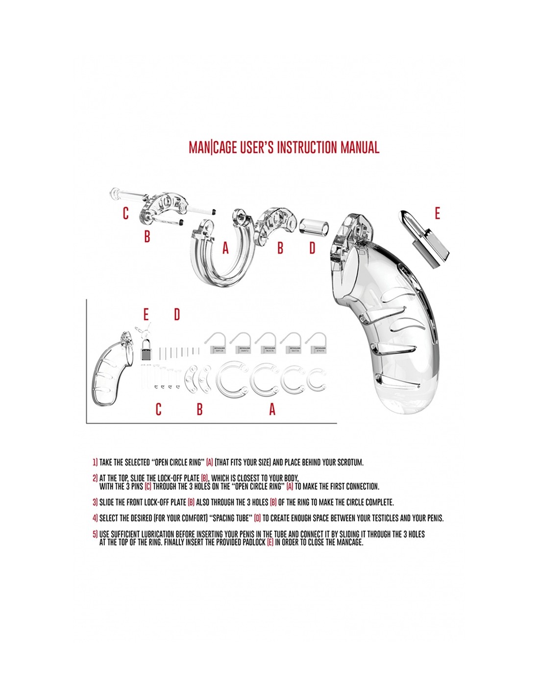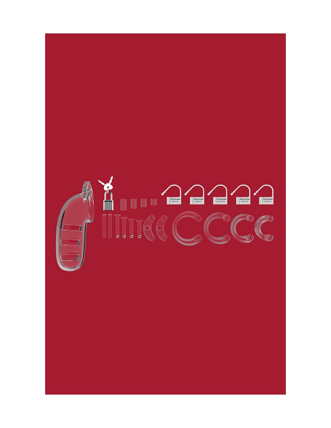 Accessoire de contrainte par excellence, la cage peut se verrouiller à l'aide d'un cadenas en métal (1 fourni) ou d'un cadenas en plastique jetable (5 fournis). L'utilisation de cadenas en plastique vous garantit de ne pas déclencher l'alarme des détecteurs de métaux lorsque vous passez sous un portique de sécurité dans un aéroport par exemple.