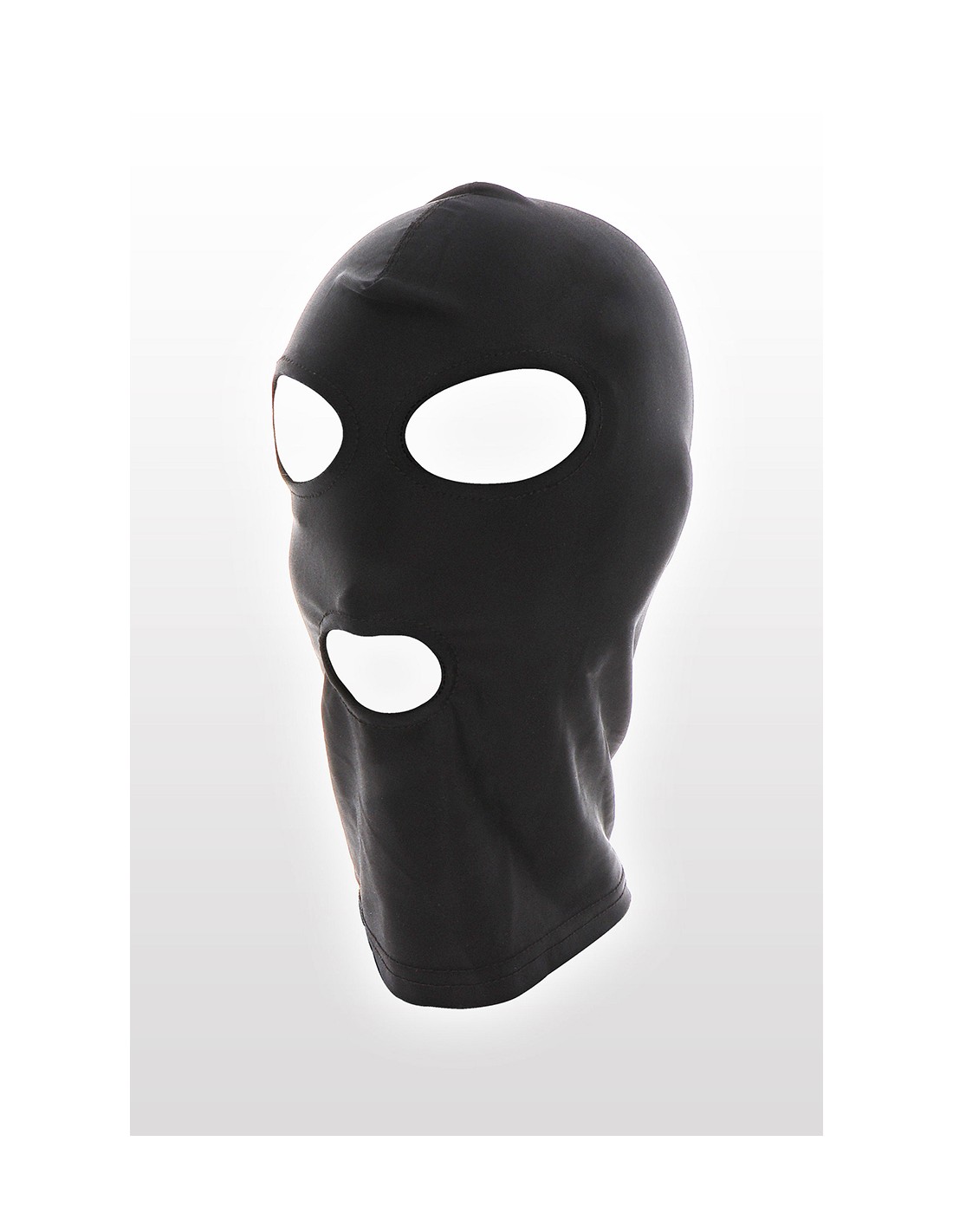 Mystère et anonymat avec la cagoule Cagoule BDSM 3 ouvertures Taboom.