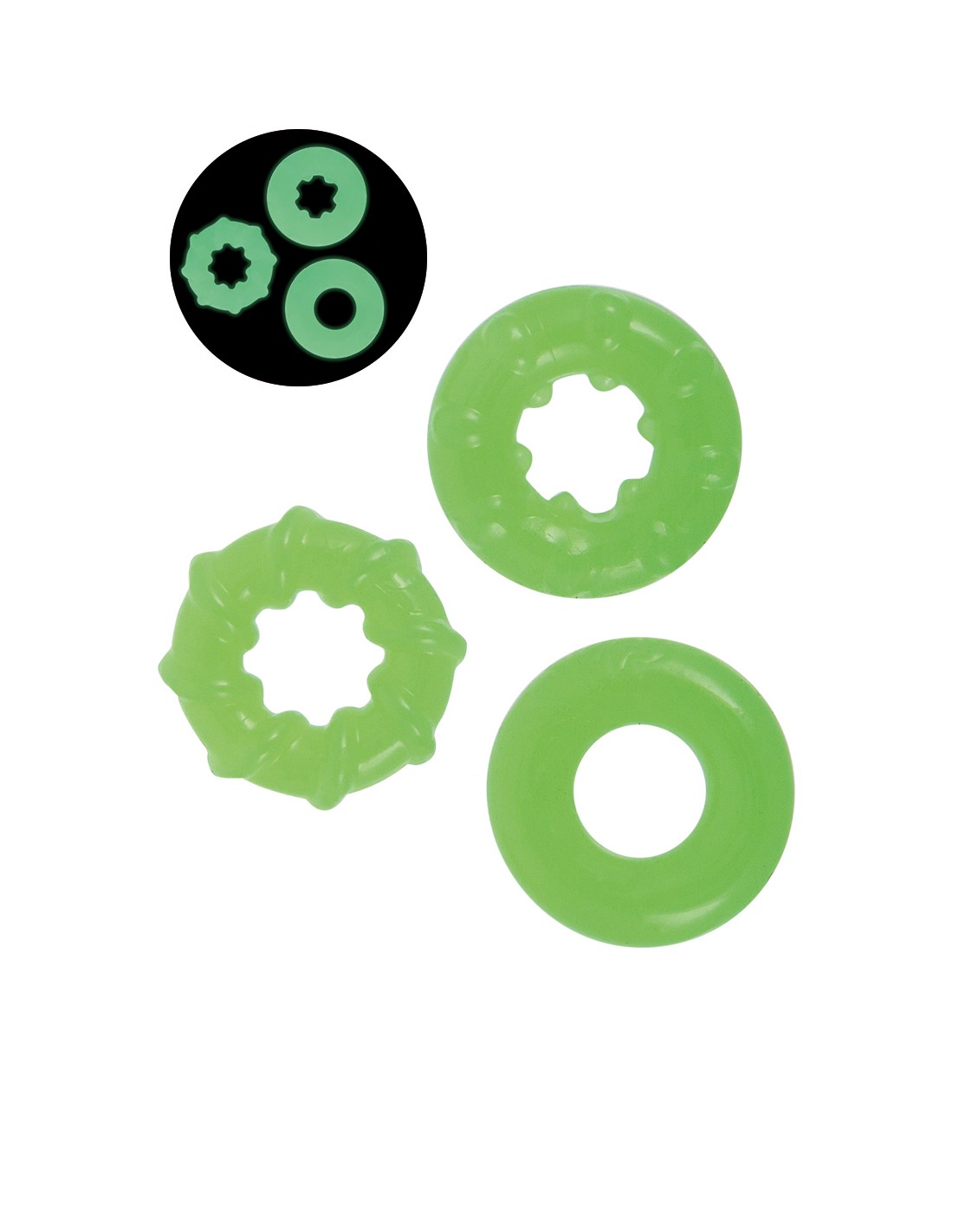 Vert phosphorescent, chacun des 3 cockrings Litolu se charge à la lumière puis brille dans le noir.