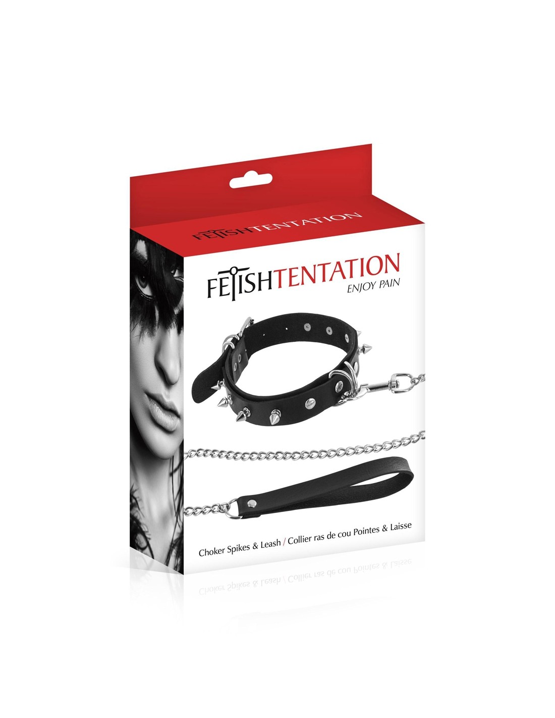 Composé d'un collier BDSM orné de 8 pointes et de 2 anneaux métalliques, ainsi que d'une laisse avec dragonne et mousqueton, cet ensemble d'accessoires de domination de la marque Fetish Tentation, est idéal pour vos jeux SM et animaliers.