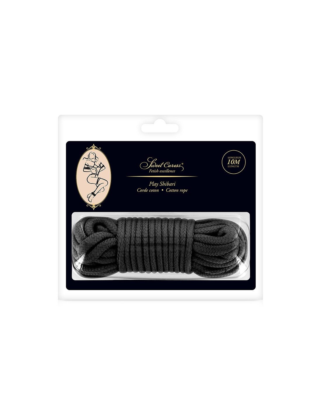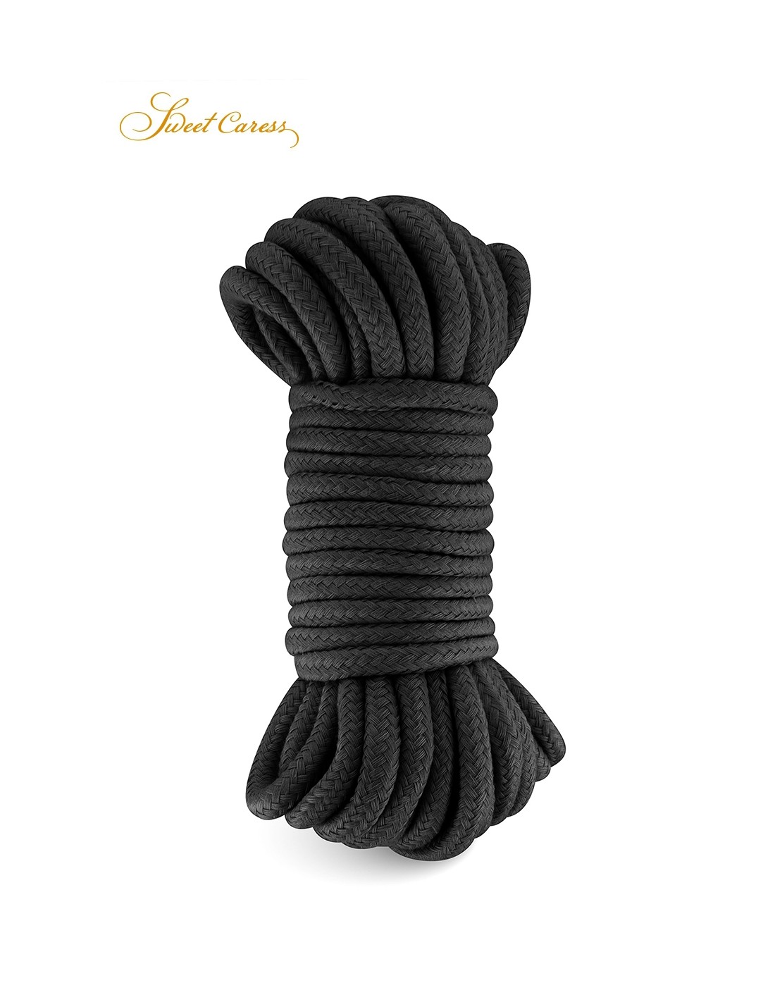 Corde de bondage en coton noir, longueur 10 mètres, pour la pratique des jeux BDSM et du shibari, par Sweet Caress.