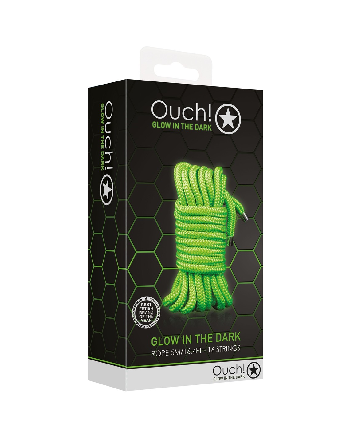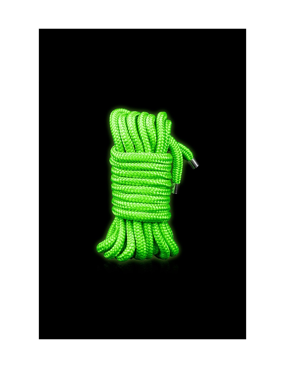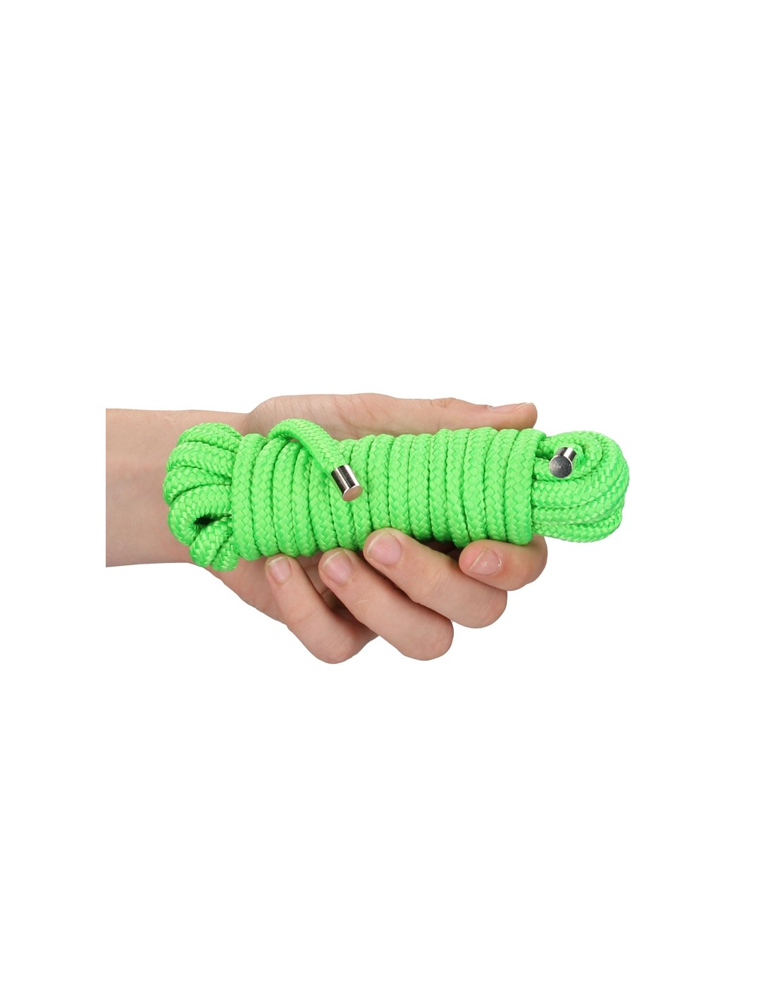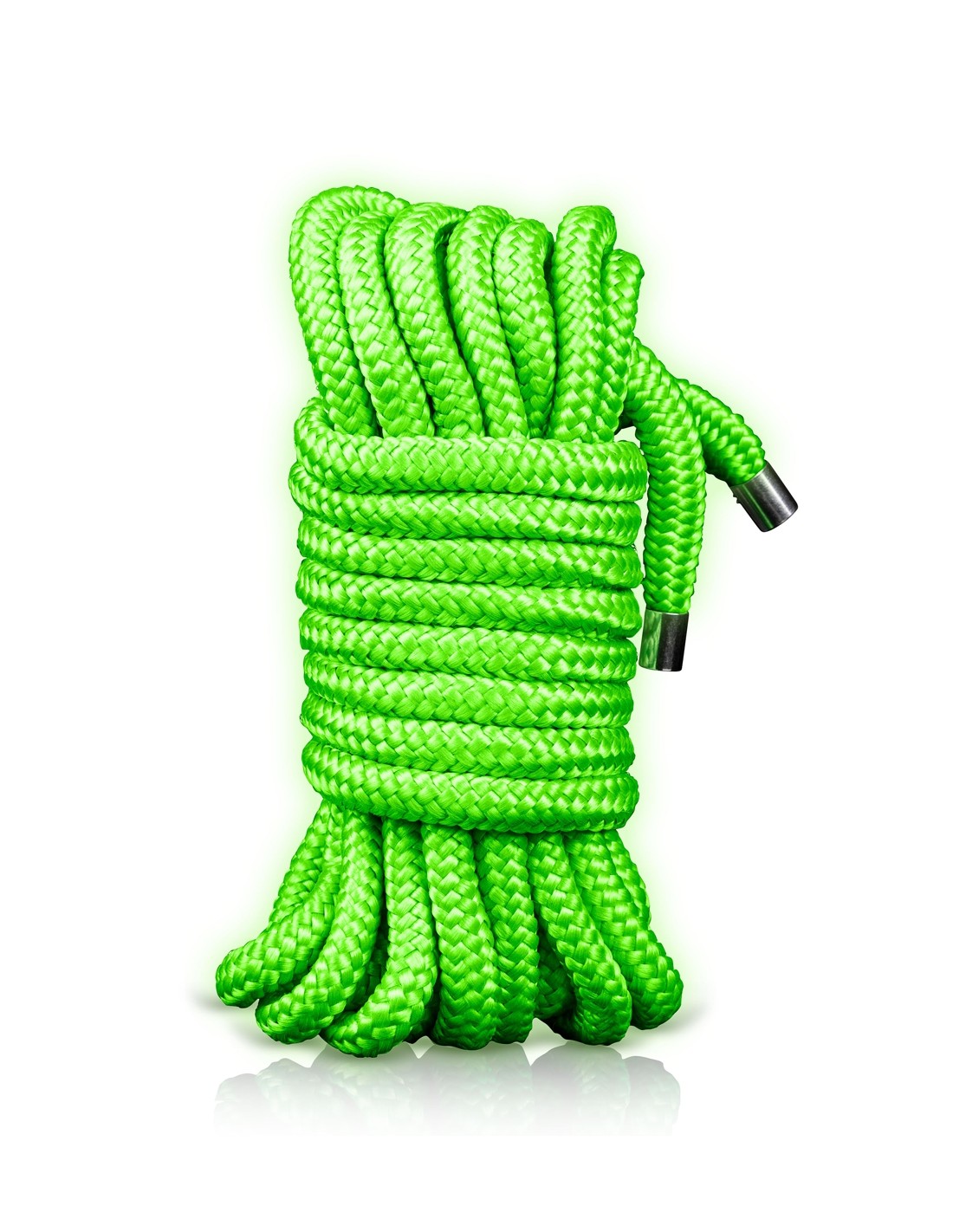 Pour les amateurs de bondage japonais, la marque Ouch! propose cette solide corde couleur vert fluo "Glow In The Dark" qui brille dans le noir, d'une longueur de 10 mètres, spéciale Shibari et jeux de bondage.