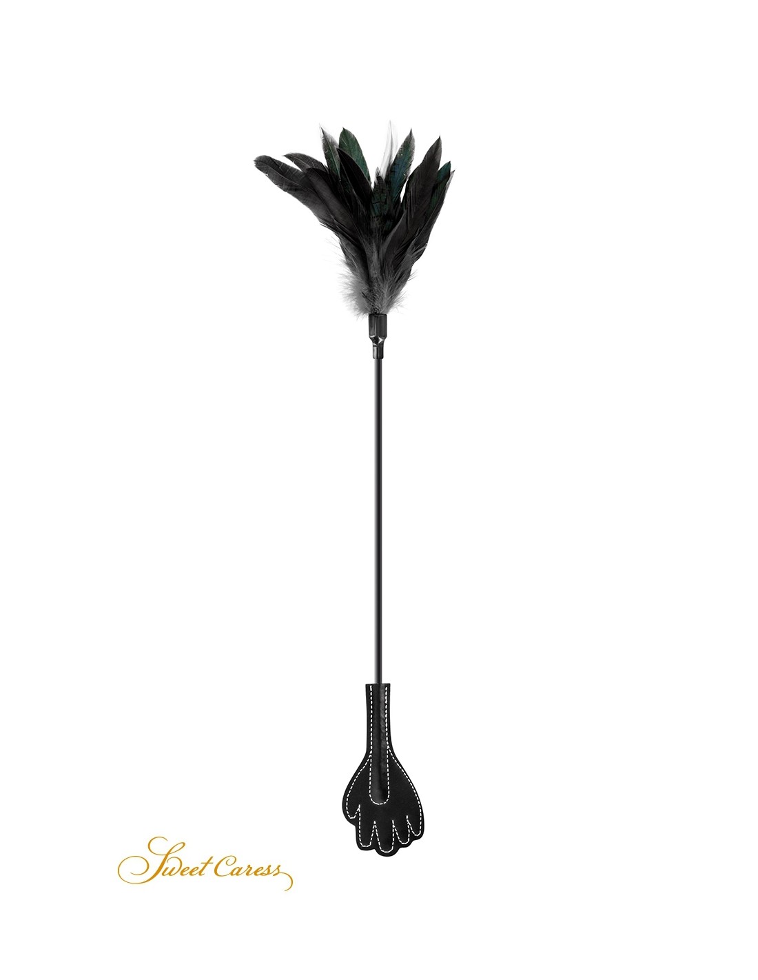 Un accessoire BDSM 2 en 1 avec un côté cravache doté d'une claquette en forme de main pour punir et un côté plumes pour faire plaisir, par Sweet Caress.