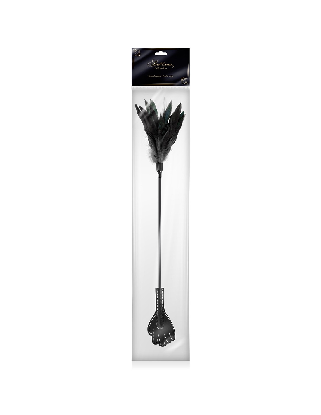 A l'autre extrémité de la cravache, la finition en plumes noires, très douce, permettra de caresser et de récompenser le (la) partenaire qui a fait preuve dobéissance.