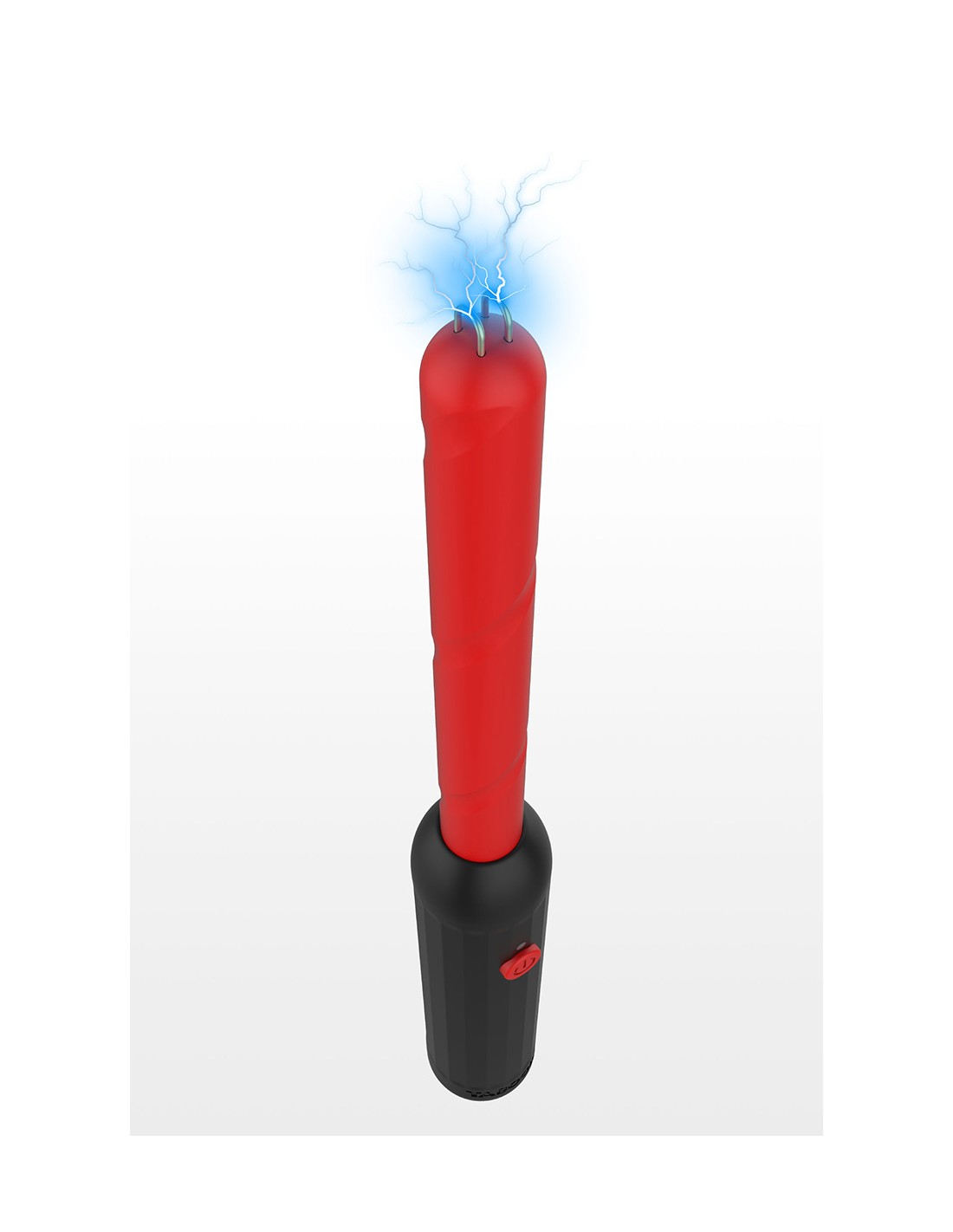 La cravache est légère. Sa poignée en caoutchouc antidérapant est non conductrice. Seuls les deux petites pointes métalliques à l'extrémité de sa tige conduisent l'électricité. Elle n'est pas destinée à frapper votre partenaire comme avec une cravache classique.