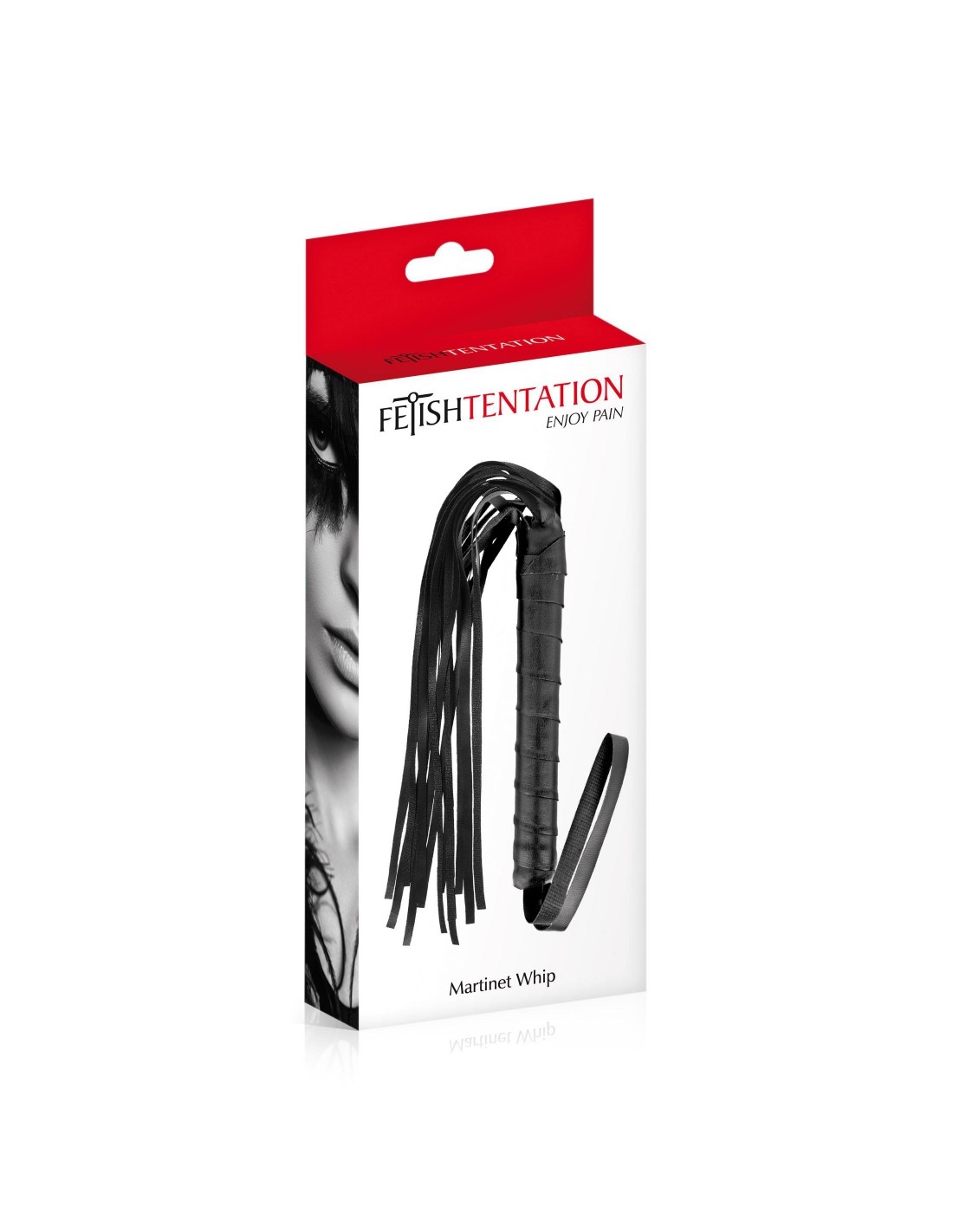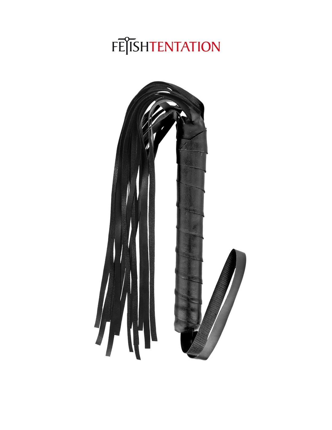 Martinet en cuir synthétique noir équipé de 13 lanières ultra douces pour des punitions tout en douceur, par la marque Fetish Tentation .