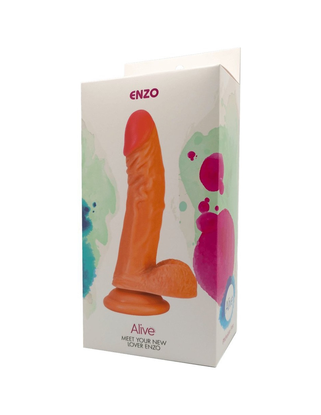 Le gode Enzo est une reproduction réaliste d'une belle verge de taille conséquente (21 x 4,3 cm), doté d'une ventouse puissante pour le fixer sur n'importe quelle surface plane, par la marque Alive.