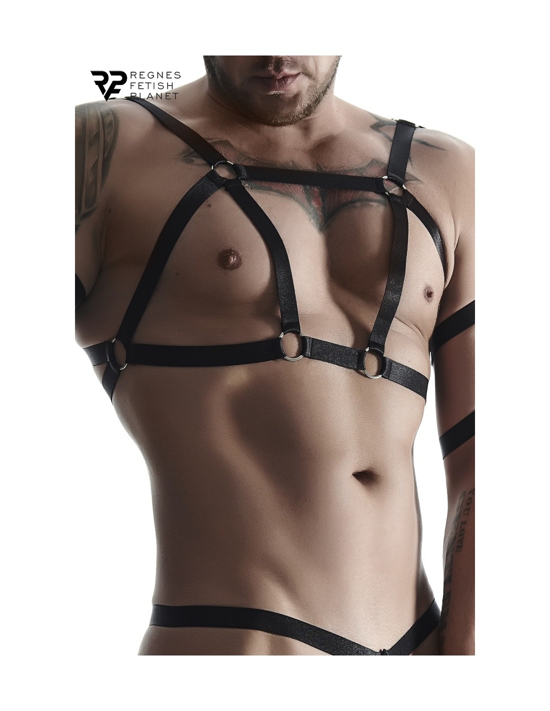 Superbe ensemble BDSM pour homme en tissu élastique noir. Les différentes lanières sont faites pour mettre les pectoraux et biceps en valeur pour la partie haute. En bas, deux strings ouverts mettrons votre sexe et vos fesses en avant. Les lanières se rejoignent par des anneaux métalliques sans nickel.