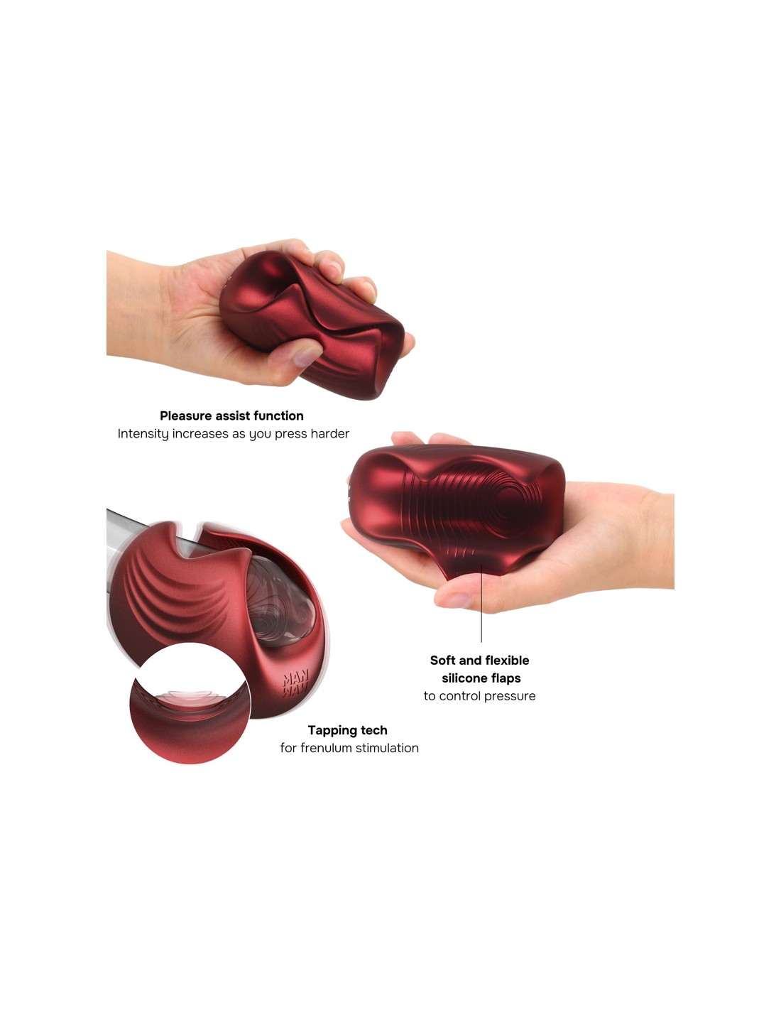 Mais son véritable super pouvoir reste sa fonction Pleasure assist. Activable ou non selon les envies, elle permet, grâce à ses capteurs intégrés, daugmenter lintensité du tapping par simple pression du stimulateur. Cette fonction, absolument unique sur le marché, alliée à la souplesse des ailettes en silicone rendent lutilisation du produit encore plus intuitive.
