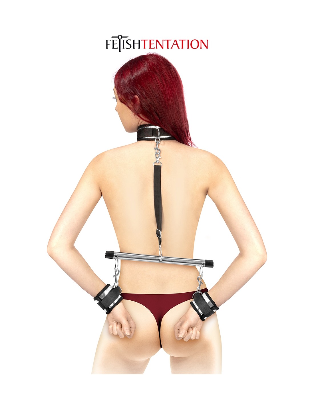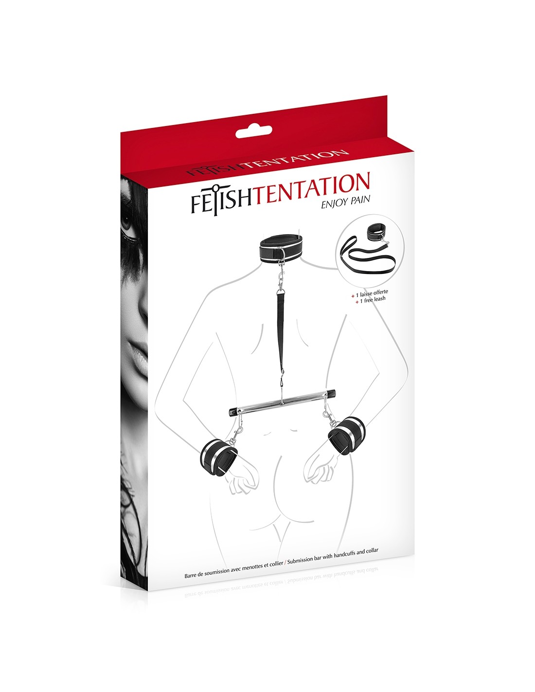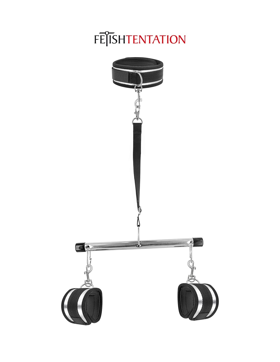 Barre de soumission avec deux menottes, une sangle, un collier et une laisse de la marque Fetish Tentation. Tout un ensemble daccessoires parfaits pour les amateurs de bondage et de domination.