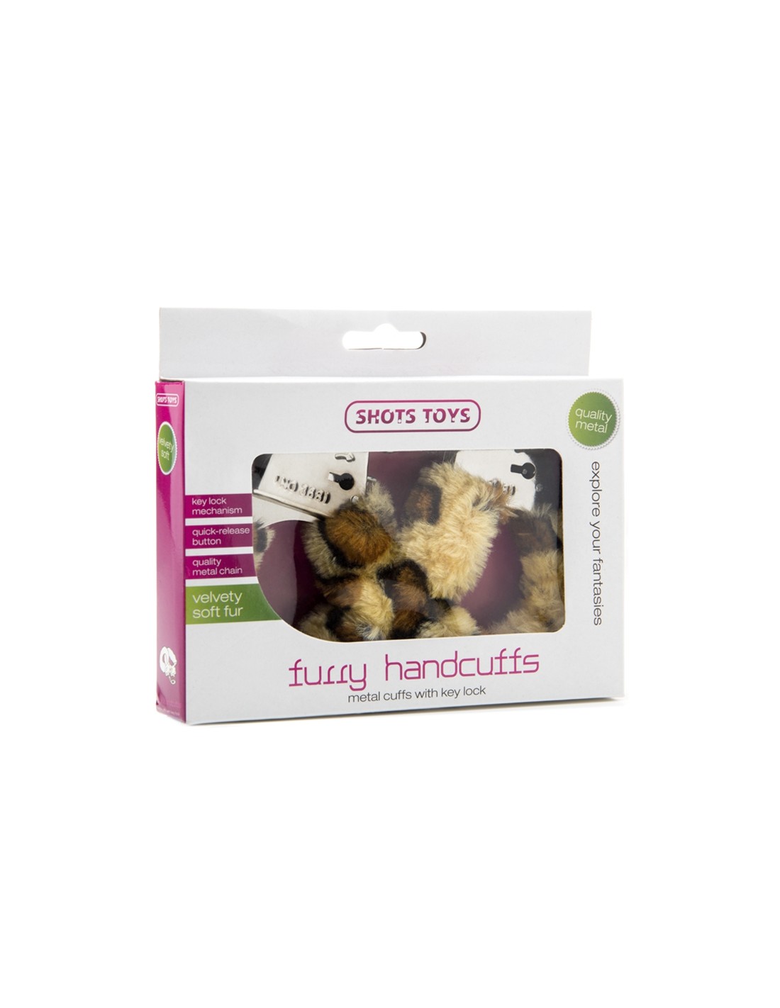 Jouez aux jeux BDSM et attachez votre amant avec ces menottes en métal et fausse fourrure imprimée Léopard de la marque Shots Toys.