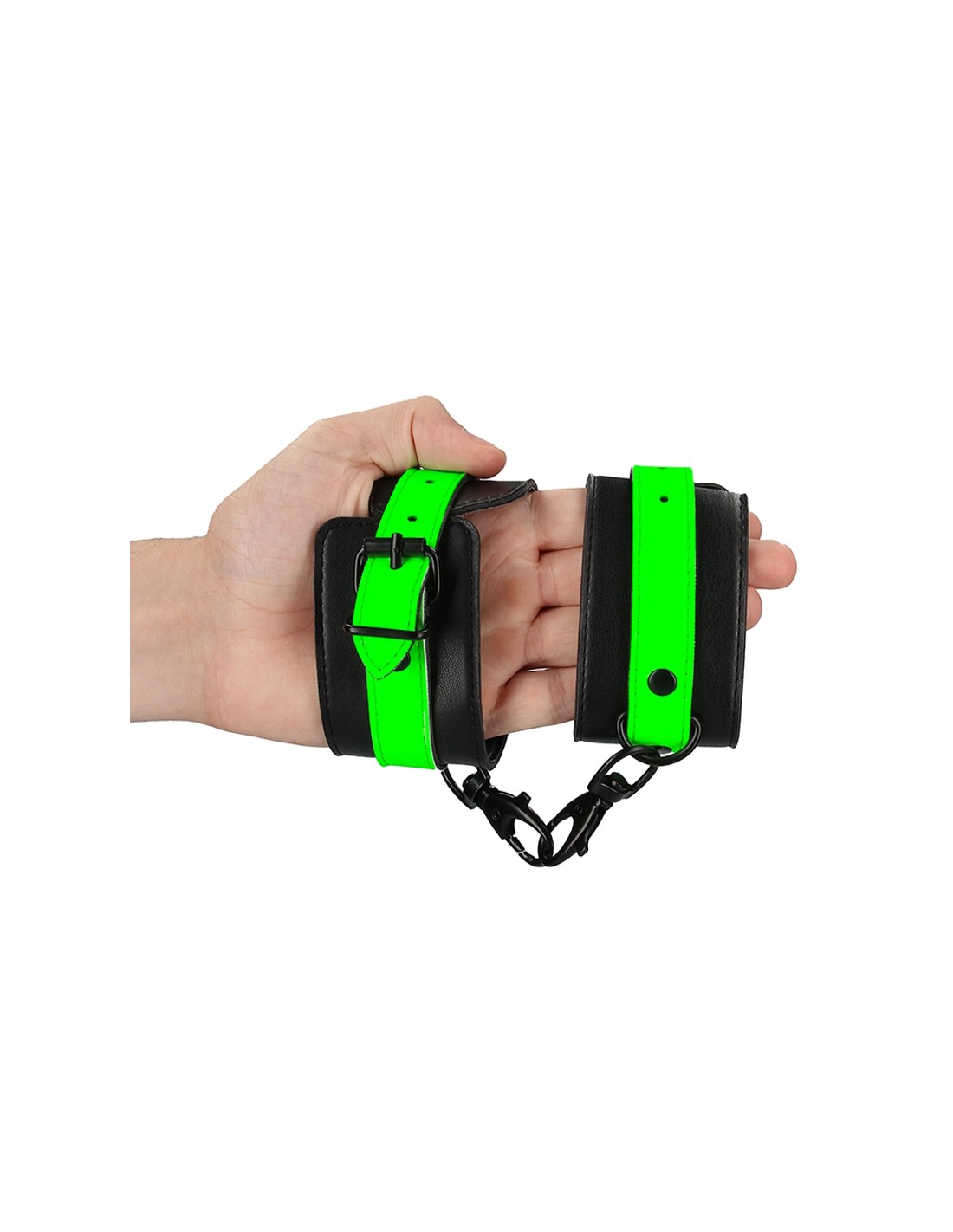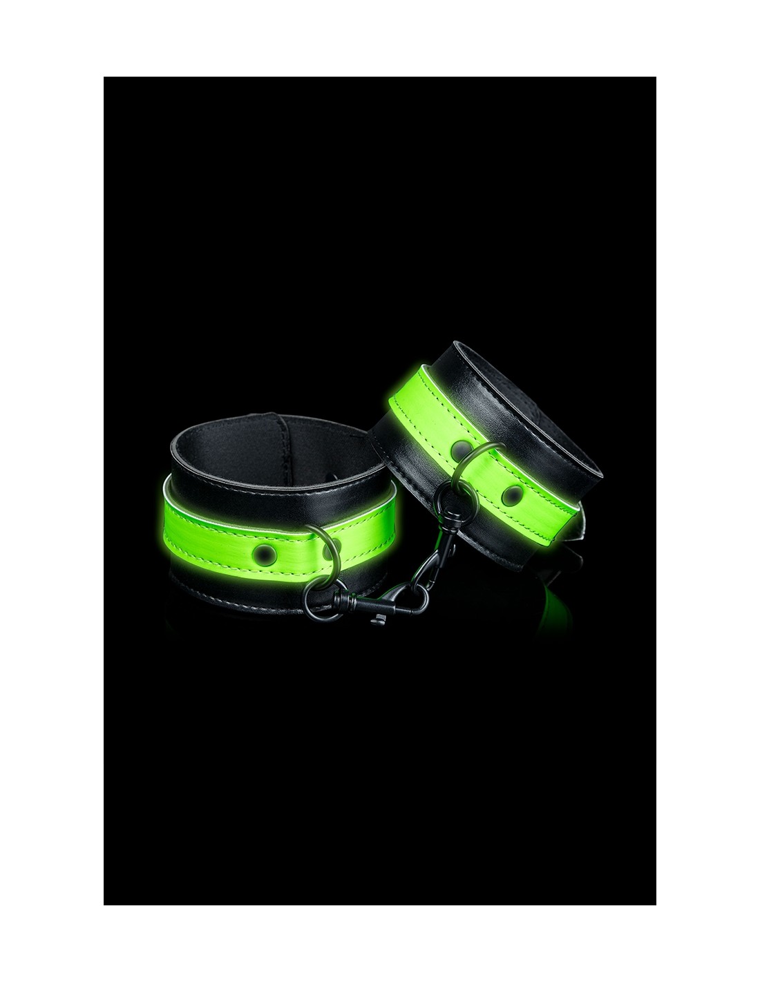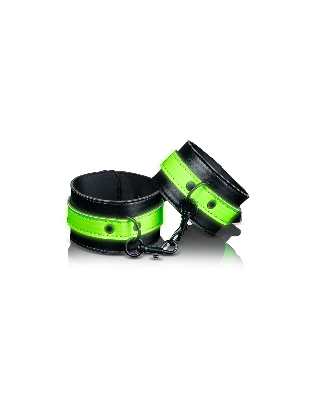 Paire de Menottes pour poignets qui brillent dans le noir, ajustables, haute qualité, en cuir reconstitué et métal, proposées par la marque Ouch!