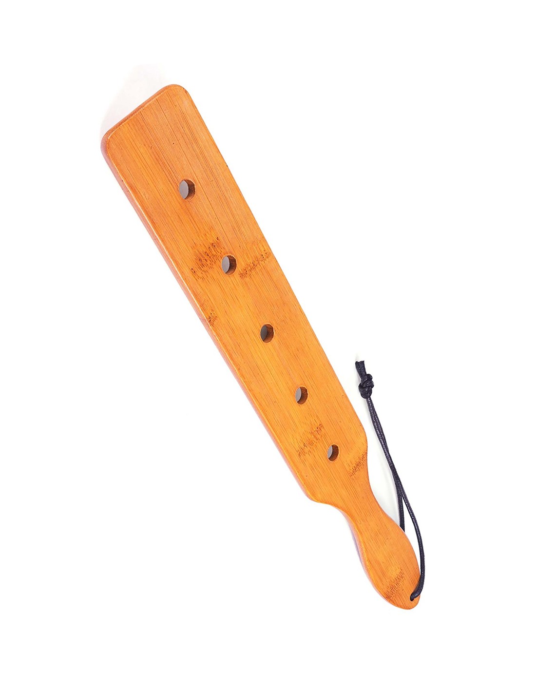 La marque Fetish Tentation propose un paddle BDSM long et rigide en bambou, traversé par 5 trous décoratifs, idéal pour vos séances de fessées.