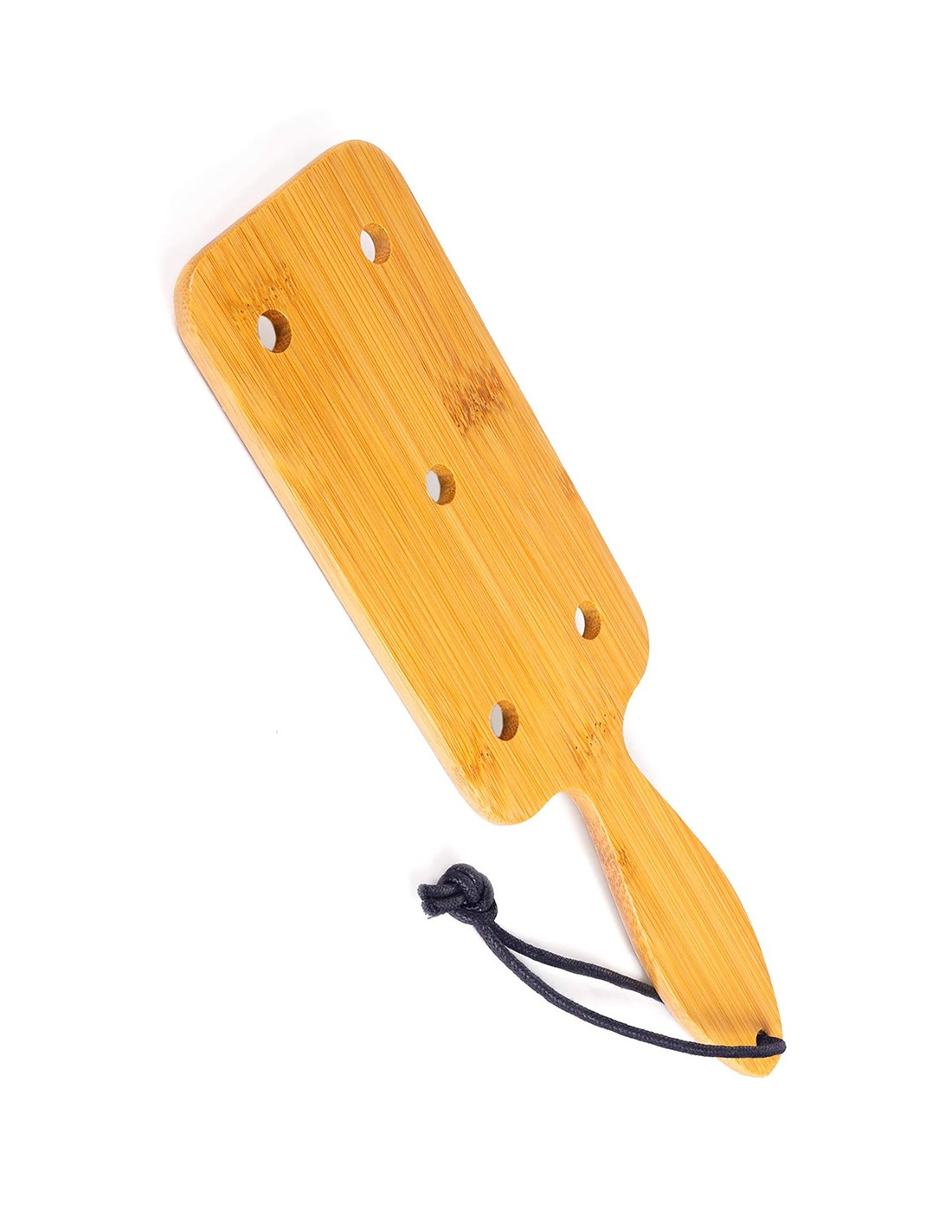 La marque Fetish Tentation propose un paddle BDSM court et large en bambou, traversé par 5 trous décoratifs, idéal pour vos séances de fessées.