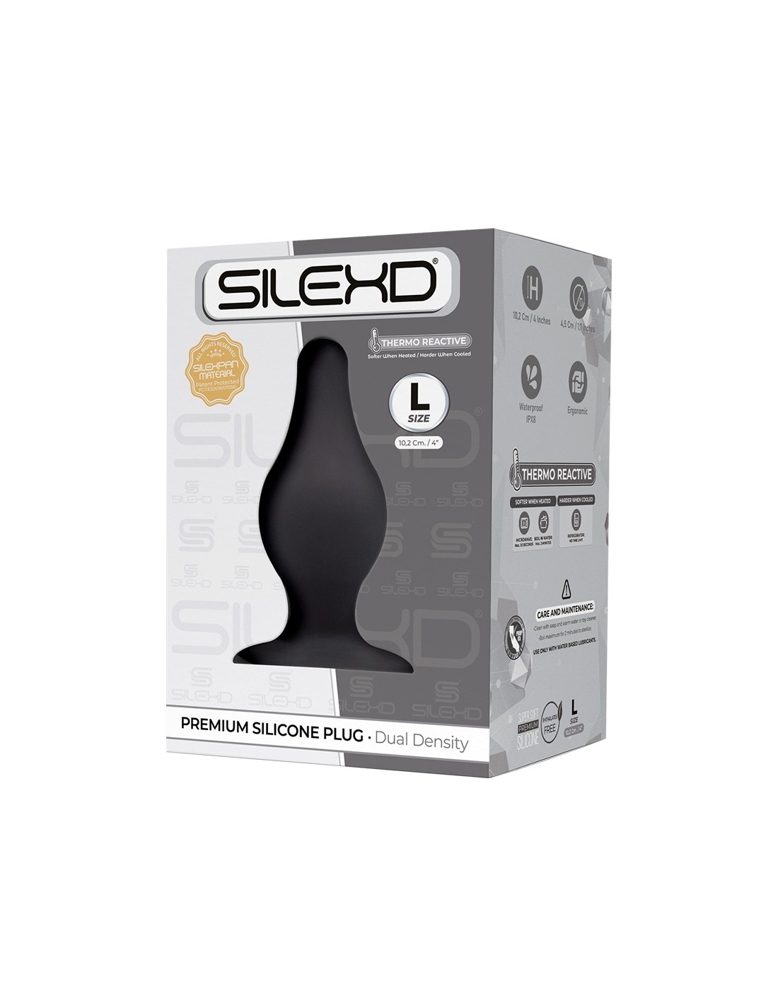 La marque SilexD propose aux amateurs de plaisir anal ce luxueux plug anal taille Large, double densité et thermo réactif de 10,2 cm de longueur par 4,5 cm de diamètre, conçu en silicone Premium à mémoire de forme.