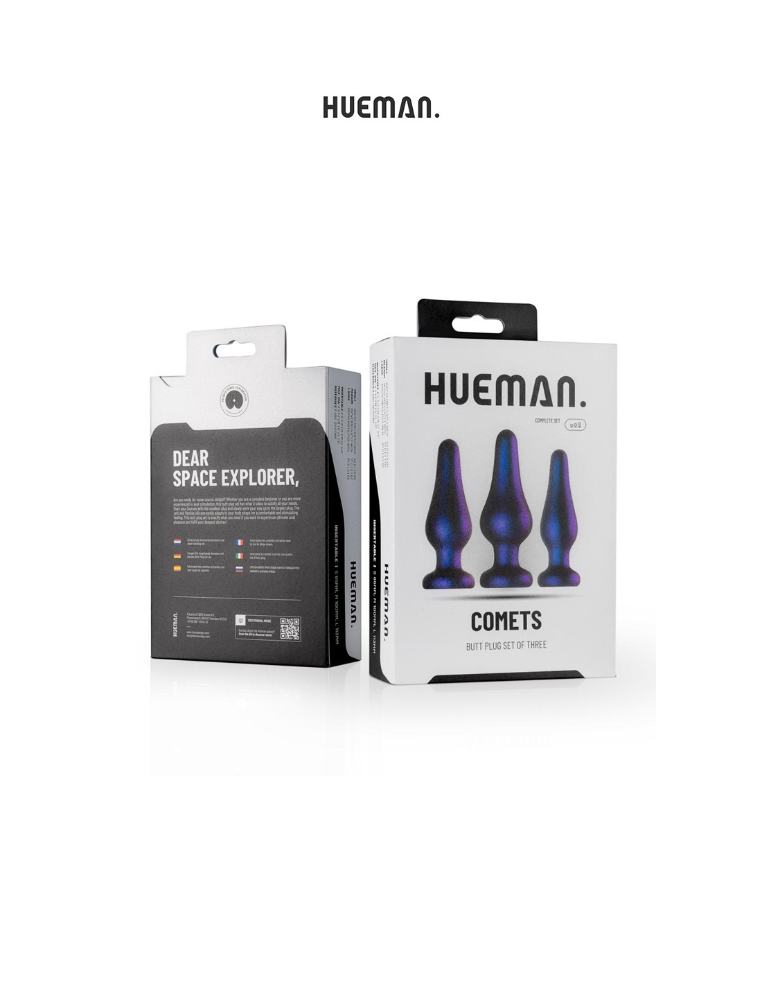 Vous découvrez l'univers du plaisir anal ? Avec ses 3 Butt plugs de différentes tailles et de grande qualité, le set Comet de la marque Hueman vous conviendra parfaitement !
