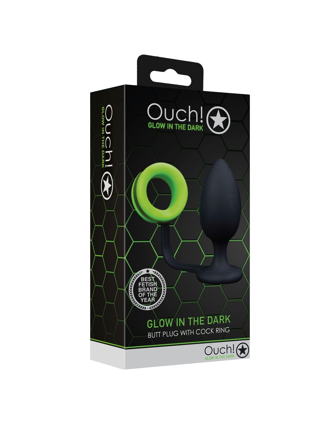 Doublez les plaisirs avec ce plug anal noir et son cockring phosphorescent de la marque Ouch!