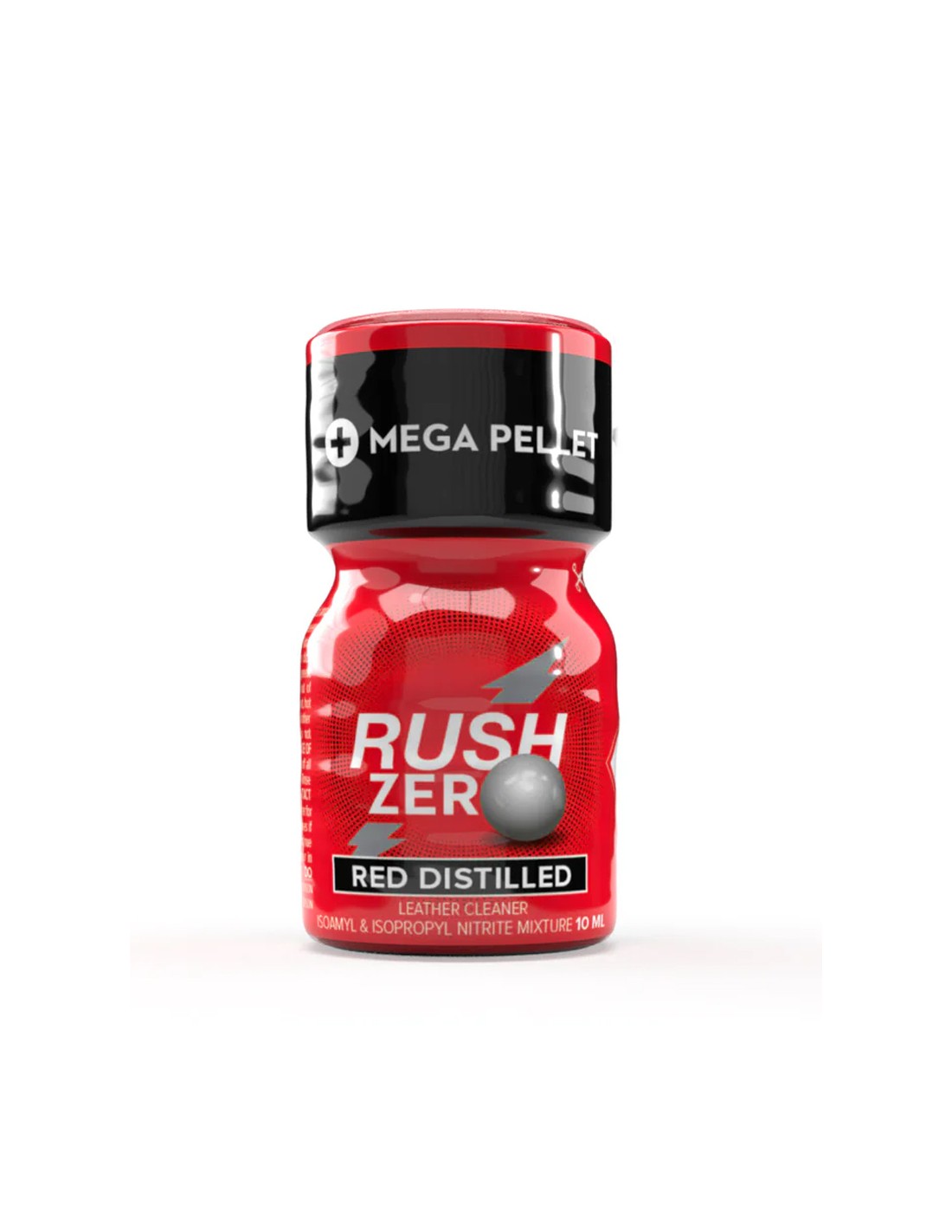 Flacon sécurisé, système à bille de pureté Méga Pellet, formulation hybride à base d'Amyle et de propyle, forte intensité, le poppers Rush Zero Red Distilled est un arôme aphrodisiaque extrêmement apprécié par les amateurs.