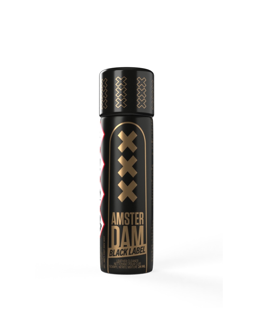 L'Arôme aphrodisiaque Amsterdam XXX Black label est un euphorisant sexuel extra fort à base d'Isoamyl nitrite (un composant chimique très fort et qui dure plus longtemps). Il est proposé dans un flacon XXL de 24 ml ressemblant à une cartouche.