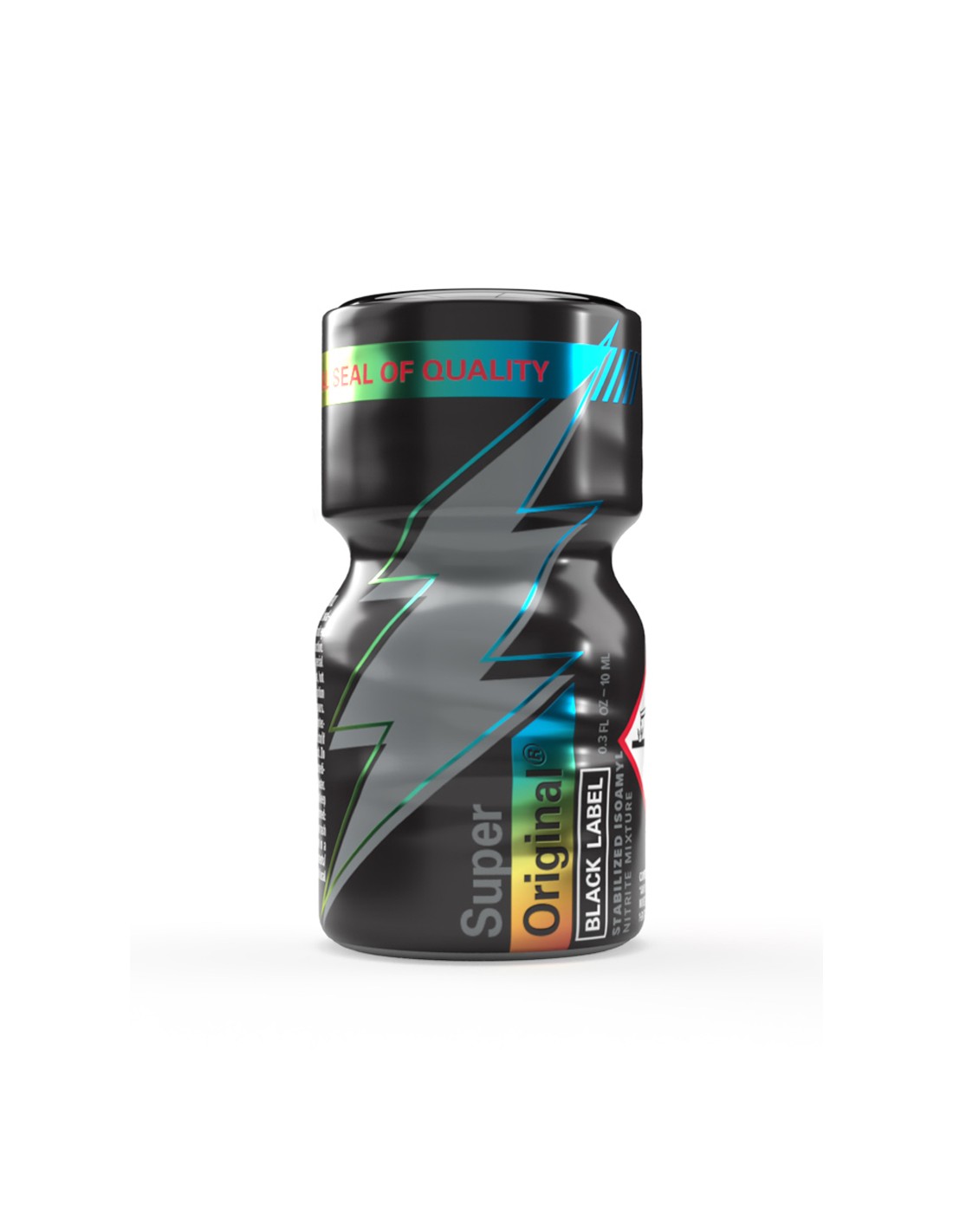 Equipé d'un bouchon anti fuite, le poppers Super Original Black Label est proposé en bouteille de 10 ml.