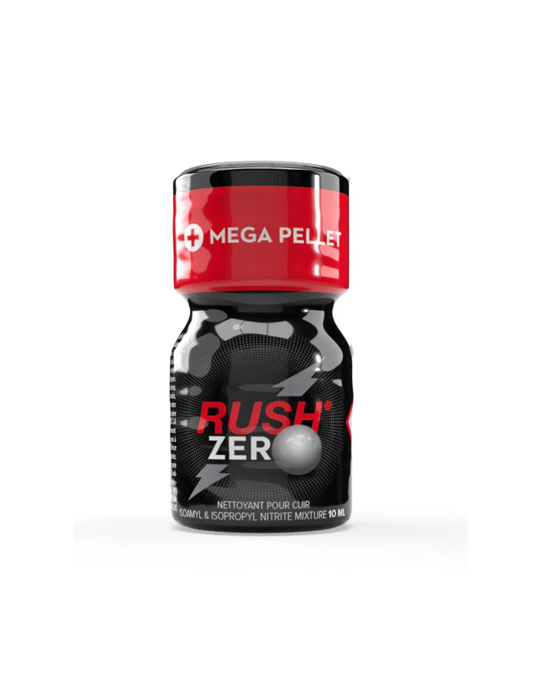 Poppers Rush ZERO, le poppers hybride ultra fort à base de nitritre de pentyle et de propyle. avec système "Mega Pellet", une bille protectrice à l'entrée du flacon permettant de conserver l'arôme du poppers plus longtemps.