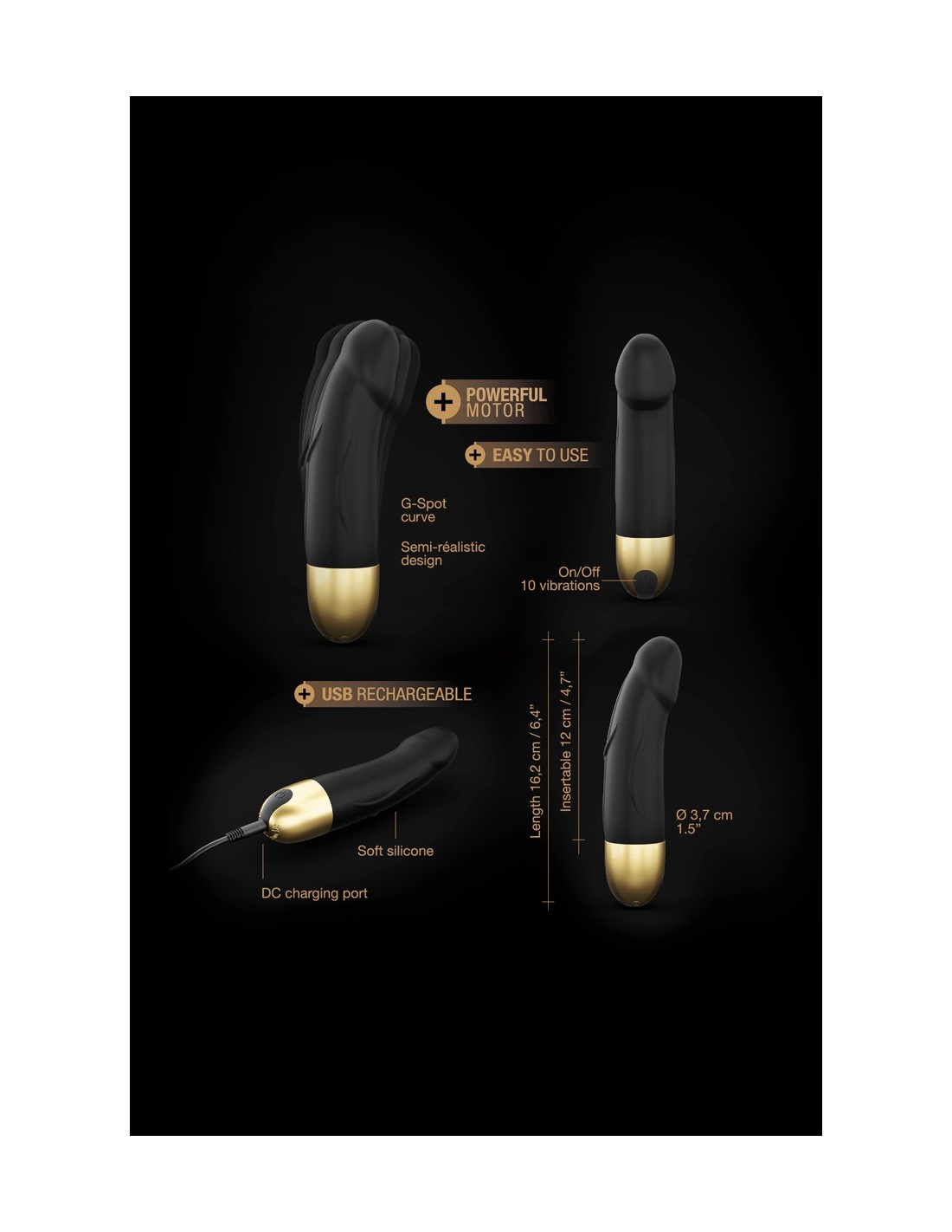 Plus petit modèle de la série Real Vibration, le nouveau vibromasseur Real Vibration version 2.0 Black & Gold taille S, de chez Dorcel, est rechargeable et résiste aux éclaboussures.