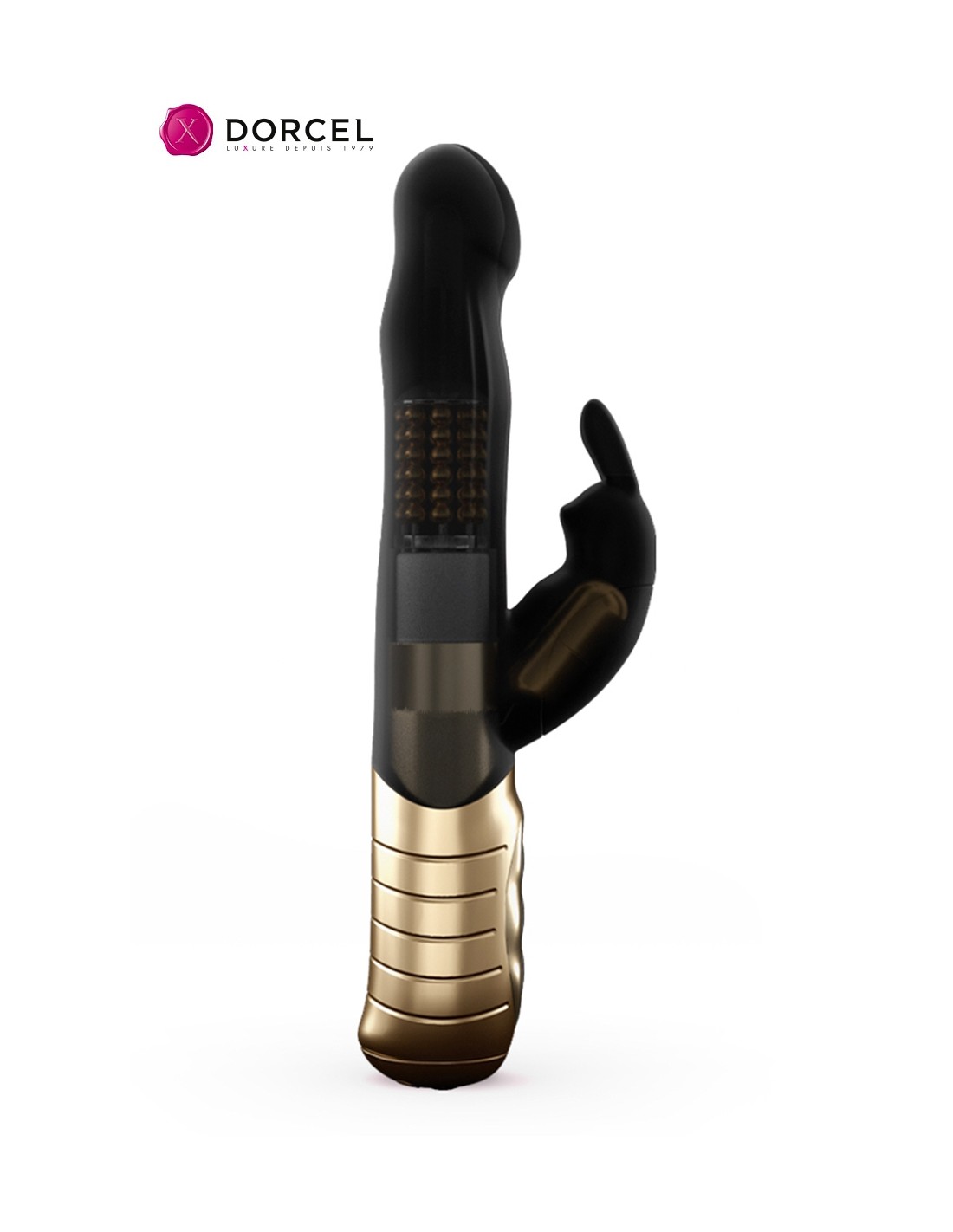 Le petit lapin vibrant sur le côté s'occupe de la stimulation clitoridienne tandis que des rangées de billes tournantes situées dans le corps du vibromasseur décuplent la stimulation vaginale à chaque va et vient du sextoy.